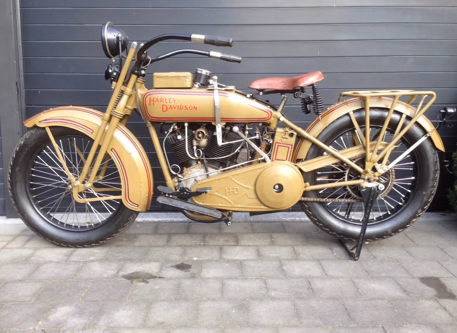 Amerikaanse Harley-Davidson model JE. Dit is een 1000cc J model maar de E staat voor Electrical equipment model. Dit wil zeggen met contactsleutel en elektrische verlichting. Dit is een zeldzame uitvoering. Motorfiets is volledig gerestaureerd en start en loopt goed.