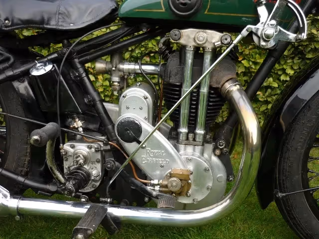 Zeer mooie oude restauratie van een Engelse Royal Enfield model 500S. Dit is een 500cc kopklepper met dubbele uitlaat van 1929. Komt uit Denemarken en heeft daar veel verschillende rondritten meegereden (zie zilveren herdenkingsplaatjes op het voorspatbord).
