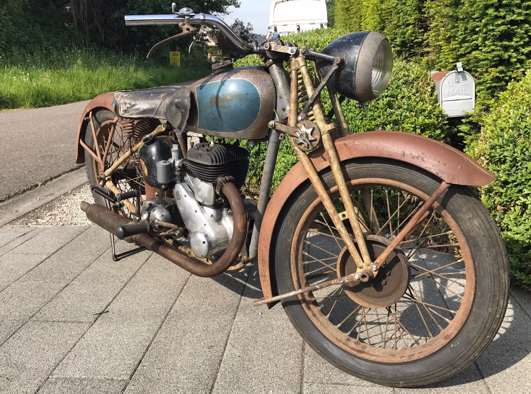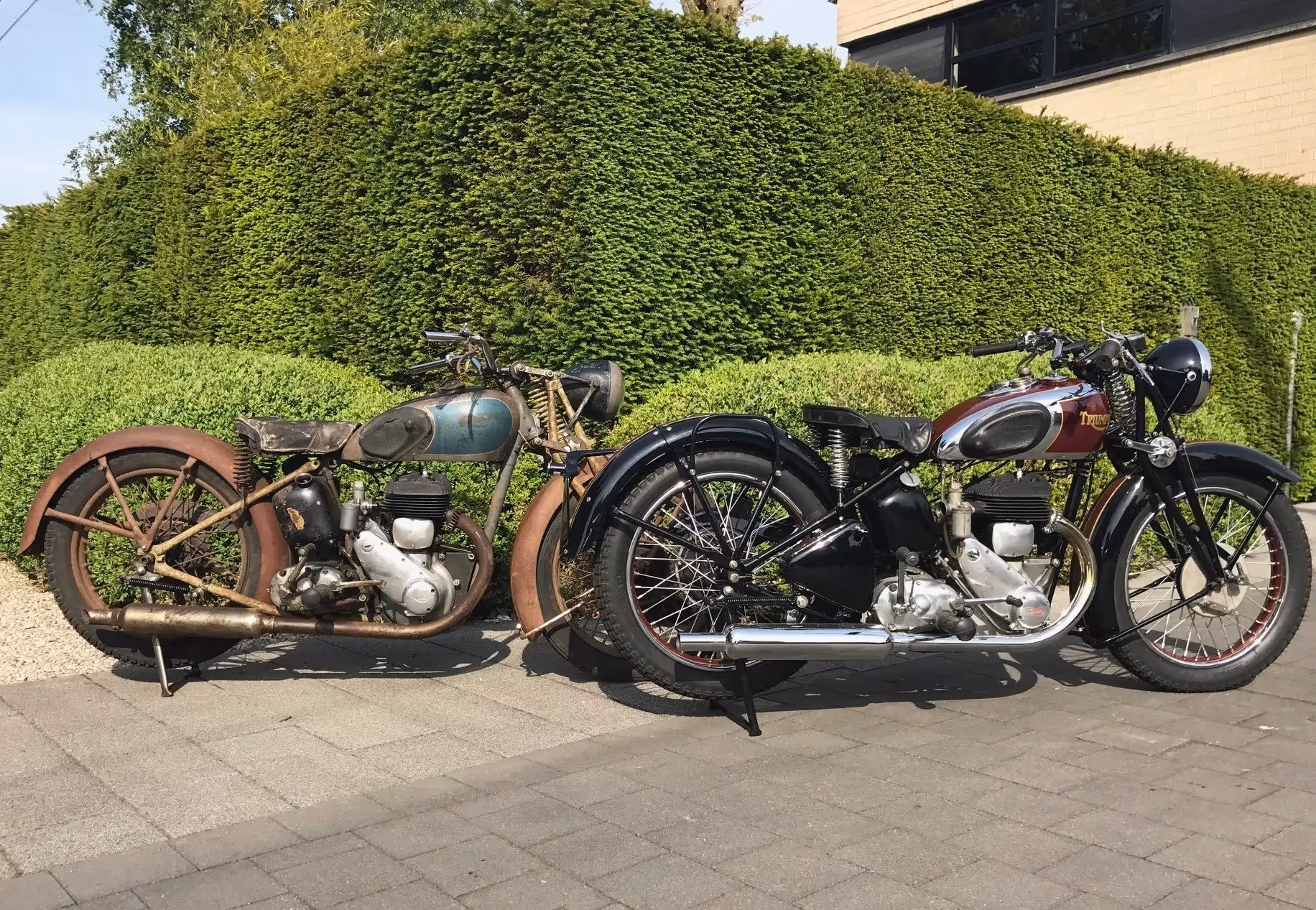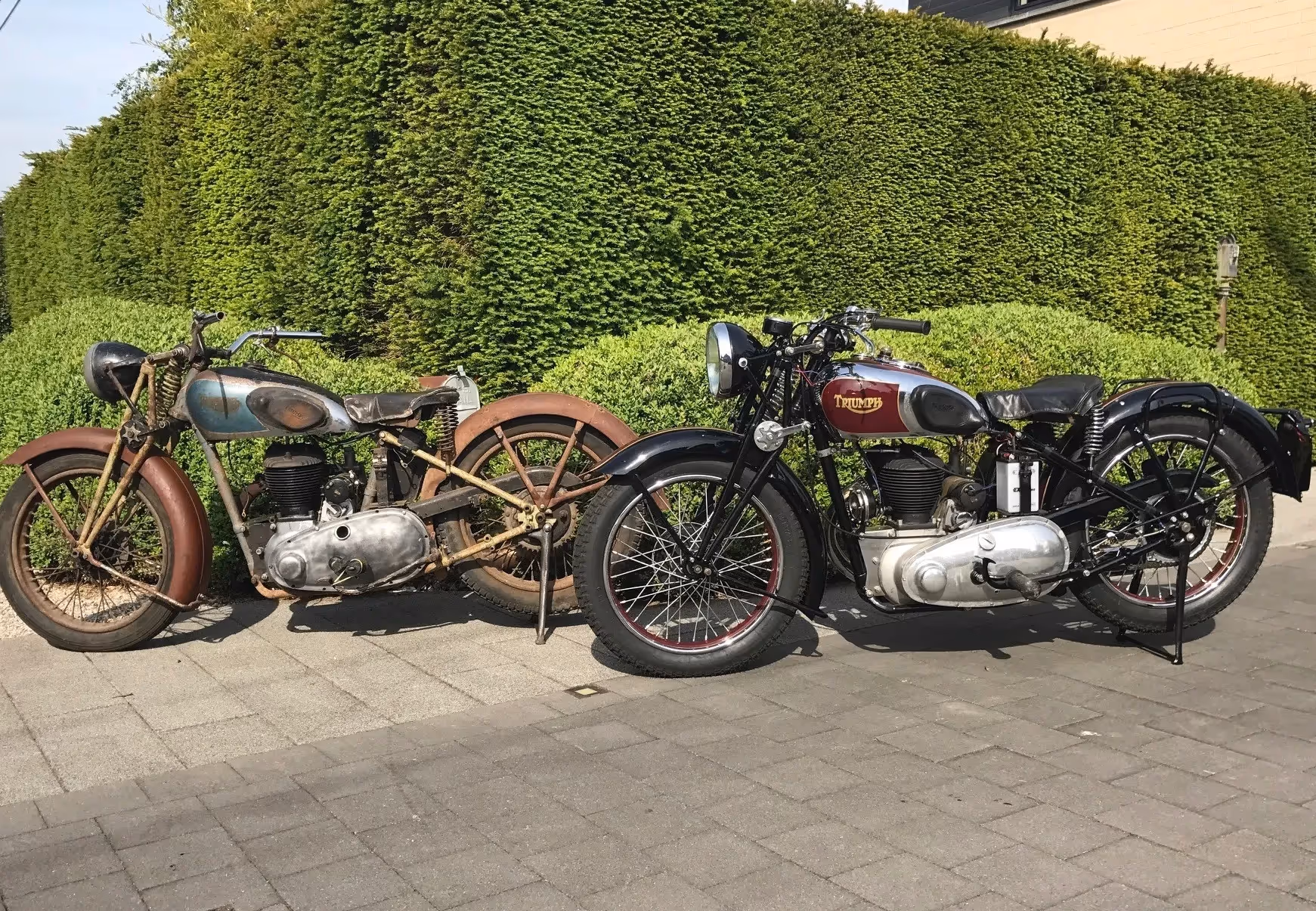 2 x Engelse Triumph 6S. Dit is een zeldzame 600cc zijklepper van 1937. Eén gerestaureerde (zie foto's) en 1 originele. Opgelet dit zijn opeenvolgende frame nummers!!! Deze 2 motorfietsen hebben samen de Triumph fabriek verlaten en zijn nu 80 jaar later terug bij elkaar gebracht.