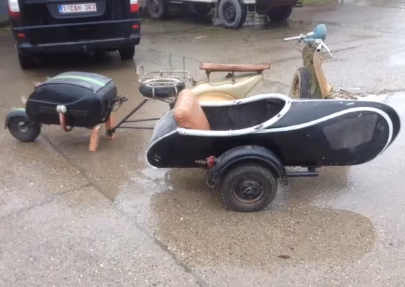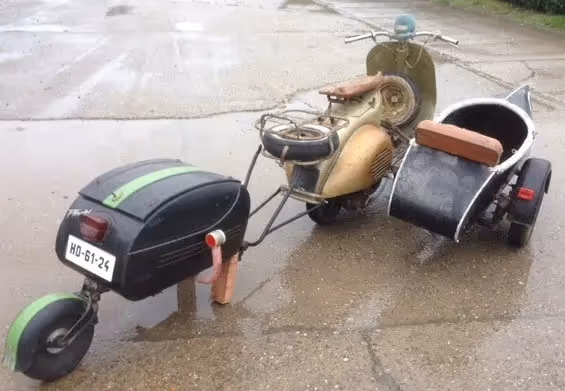 Deze combinatie van scooter met zijspan en aanhanger is zeer zeldzaam.