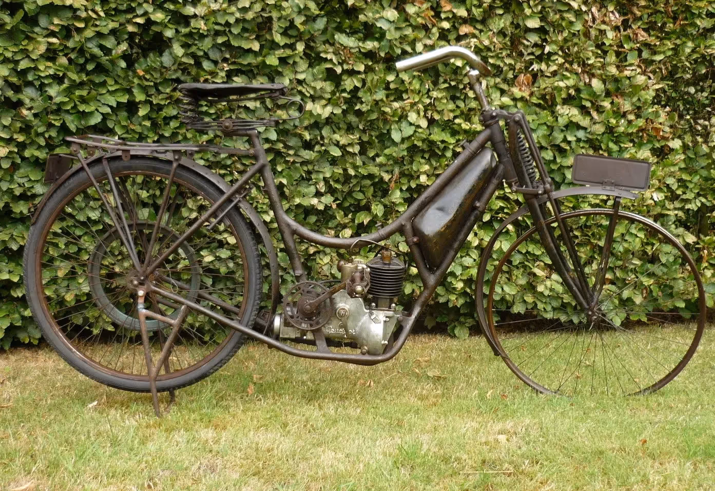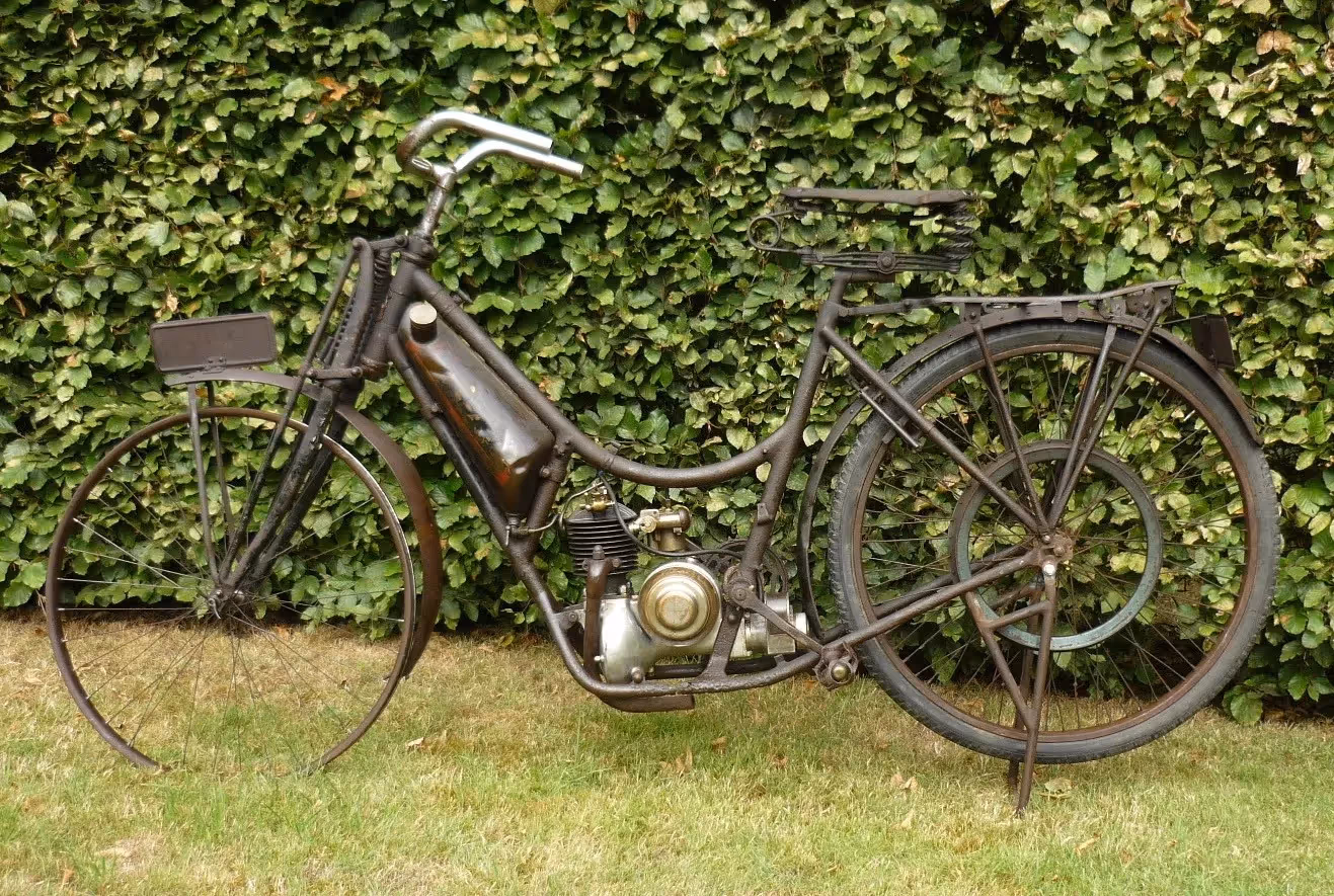 Zeldzame vroege Franse Peugeot model Cyclo-Moto. Dit is een 110cc 2 tact single speed met koppeling en riem aandrijving. Zeer mooie motor met een krukas in de lengte richting. Motor is gereviseerd en rijwielgedeelte moet nog onder handen genomen worden. Frame moet links onderaan hersteld worden.