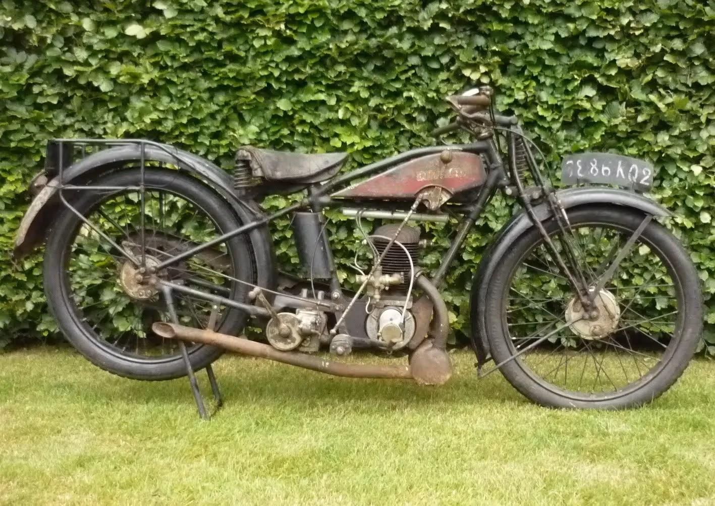 Franse Onoto type FC Sport. Dit is een 175cc 2 tact van 1925 in originele lak, nog mooi met de geschilderde biezen. De motor is een Moussard & Madoz met dubbele uitlaat, dit was een sportmodel. Vroege flattanker met de eerste trommelremmen. Kijk ook eens naar de plaats van de magneet, rechtstreeks op de krukas.