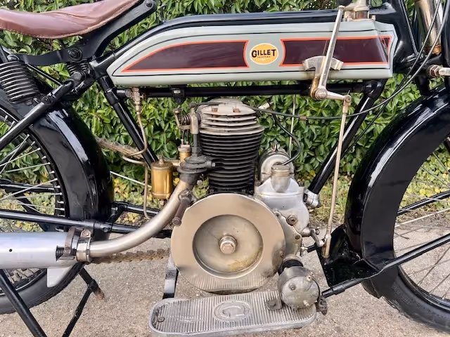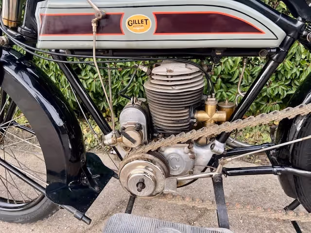 In 1920 start Gillet met de productie van hun eerste motorfiets een 300cc 2 takt die later een 350cc werd. Mooie oude restauratie, die volledig is nagezien en nu terug rijklaar is.