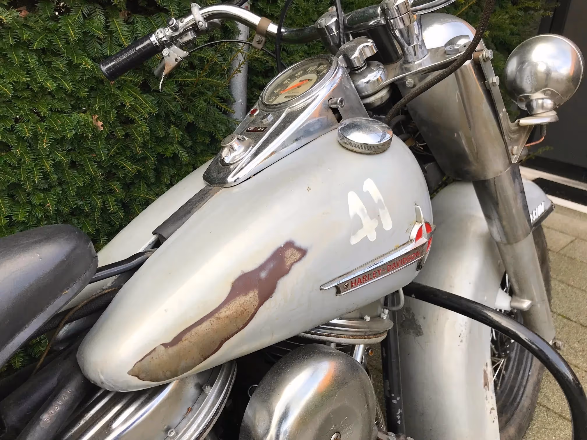 Belgische escorte motorfiets van de Politie Brussel in 100% original staat. Dit is een 1958 Panhead Duoglide. Motor en versnellingsbak is volledig gereviseerd en in goed rijdende staat. Rest van de motor in 100% originele staat. De meeste mensen kennen deze motorfietsen in blauwe kleur maar dit is een aanpassing die pas gedaan werd in de jaren '70 door de politie. Deze motorfiets is door de staat verkocht voor ze in het blauw geverfd werden. Er zijn enkele kleine updates aan deze motorfiets gedaan tijdens zijn dienstjaren maar verder is deze volledig origineel zoals hij na zijn dienstjaren is verkocht. Verder volledig volgens de bestelling van de Belgische politie met grotere oliebak, grotere oliepomp en ander zijdeksel om deze pomp te kunnen monteren, sirene lampen en zeldzame uitvoering met handkoppeling! origineel voor 1958.
