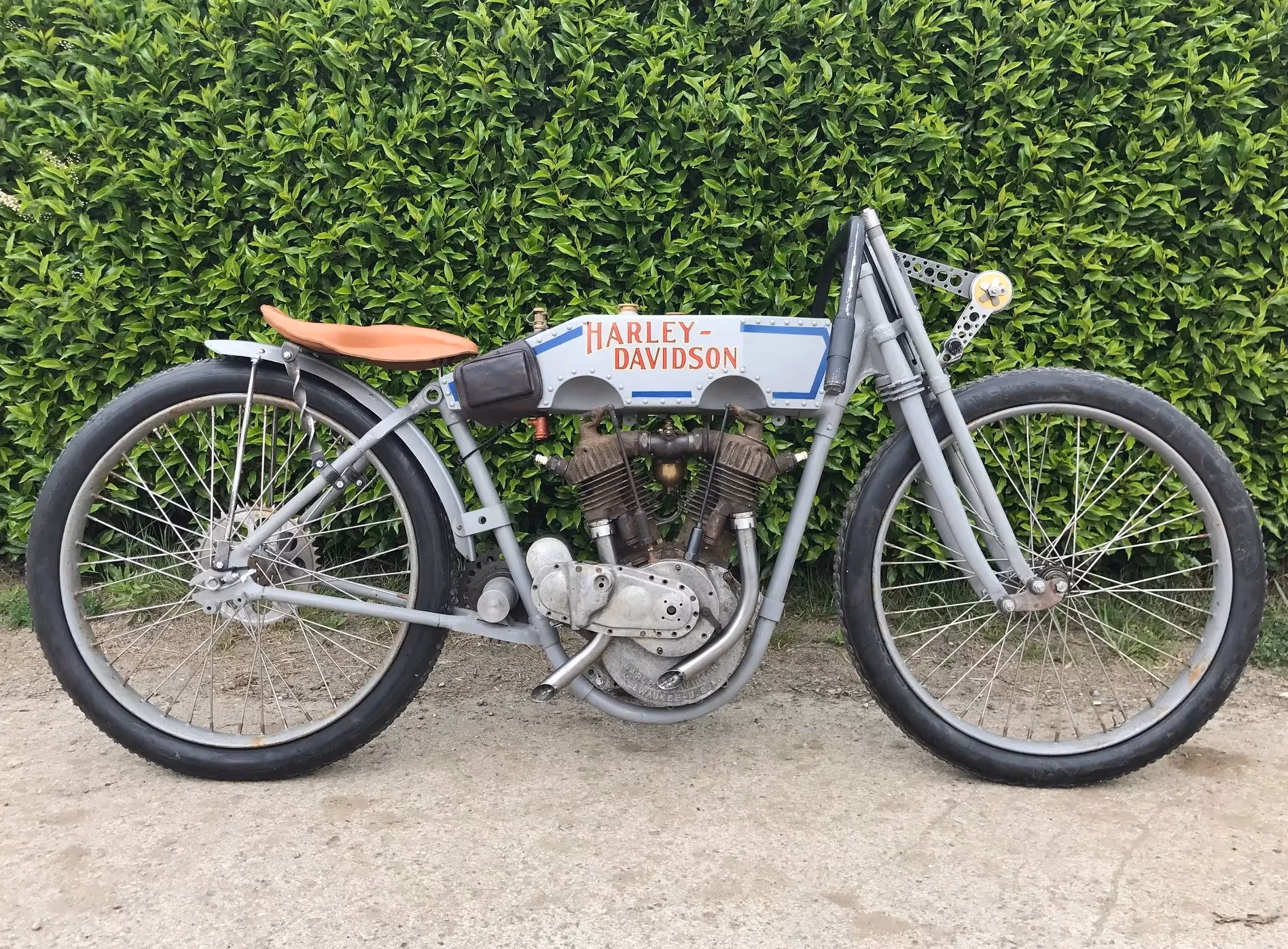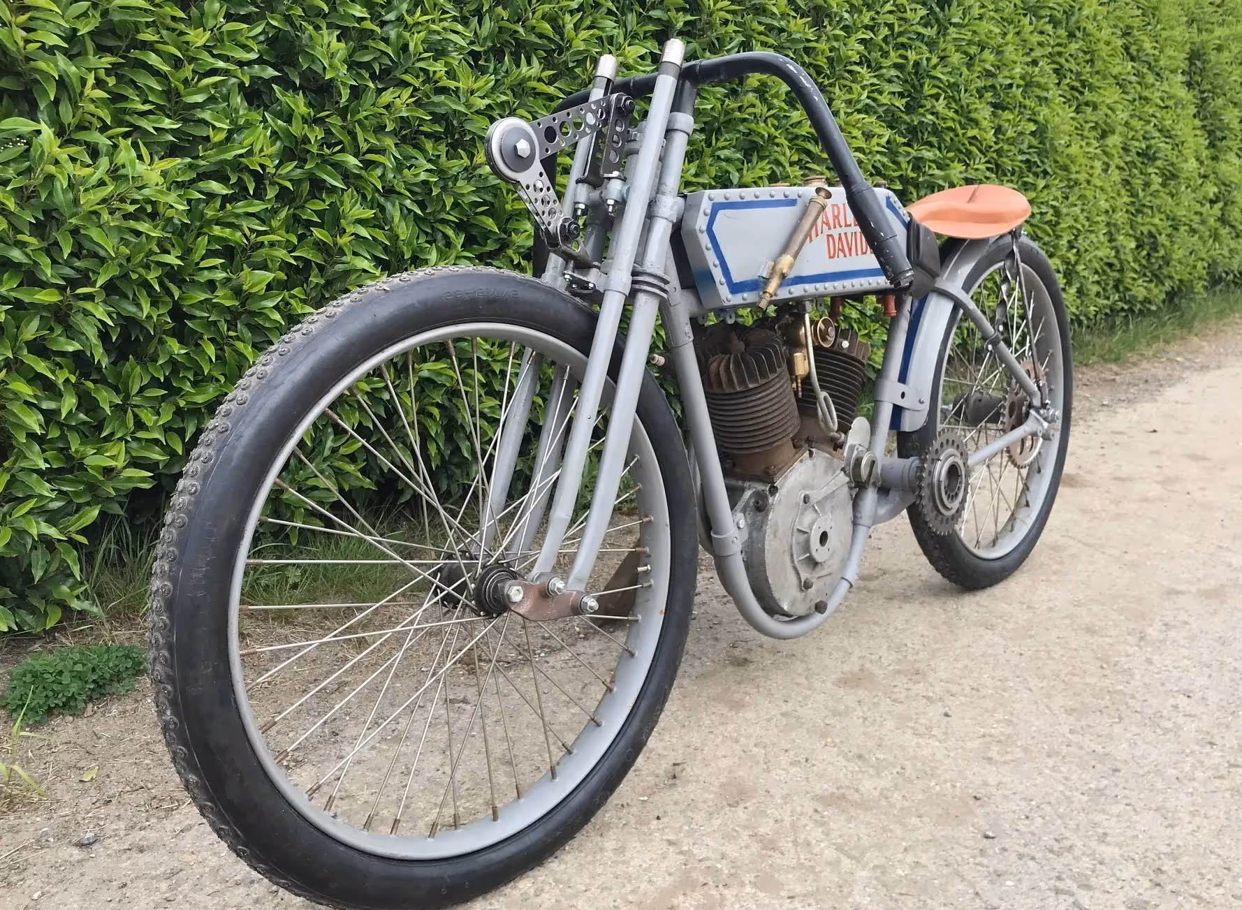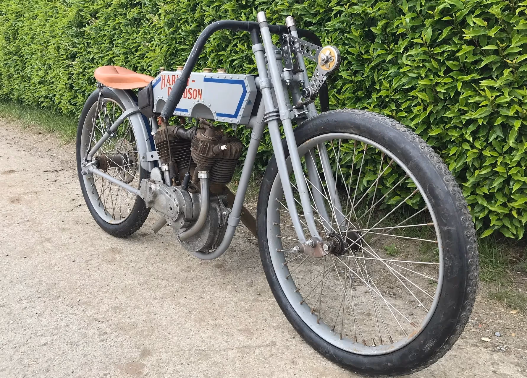 Mooi race project van een Harley-Davidson "rivet tank" racer 1915. In 1915 starte Harley officieel met het fabrieks race team. Dit was het model dat ze gebruikte om te racen. Zonder trapstel maar met een kettingoverbrenging naar het achterwiel. De tank was een aangepaste verstevigde gereveteerde tank. Men had nog keuze uit de vaste voorvork en de geveerde voorvork zoals deze. Motor is compleet. Nieuwe Croker racebanden.