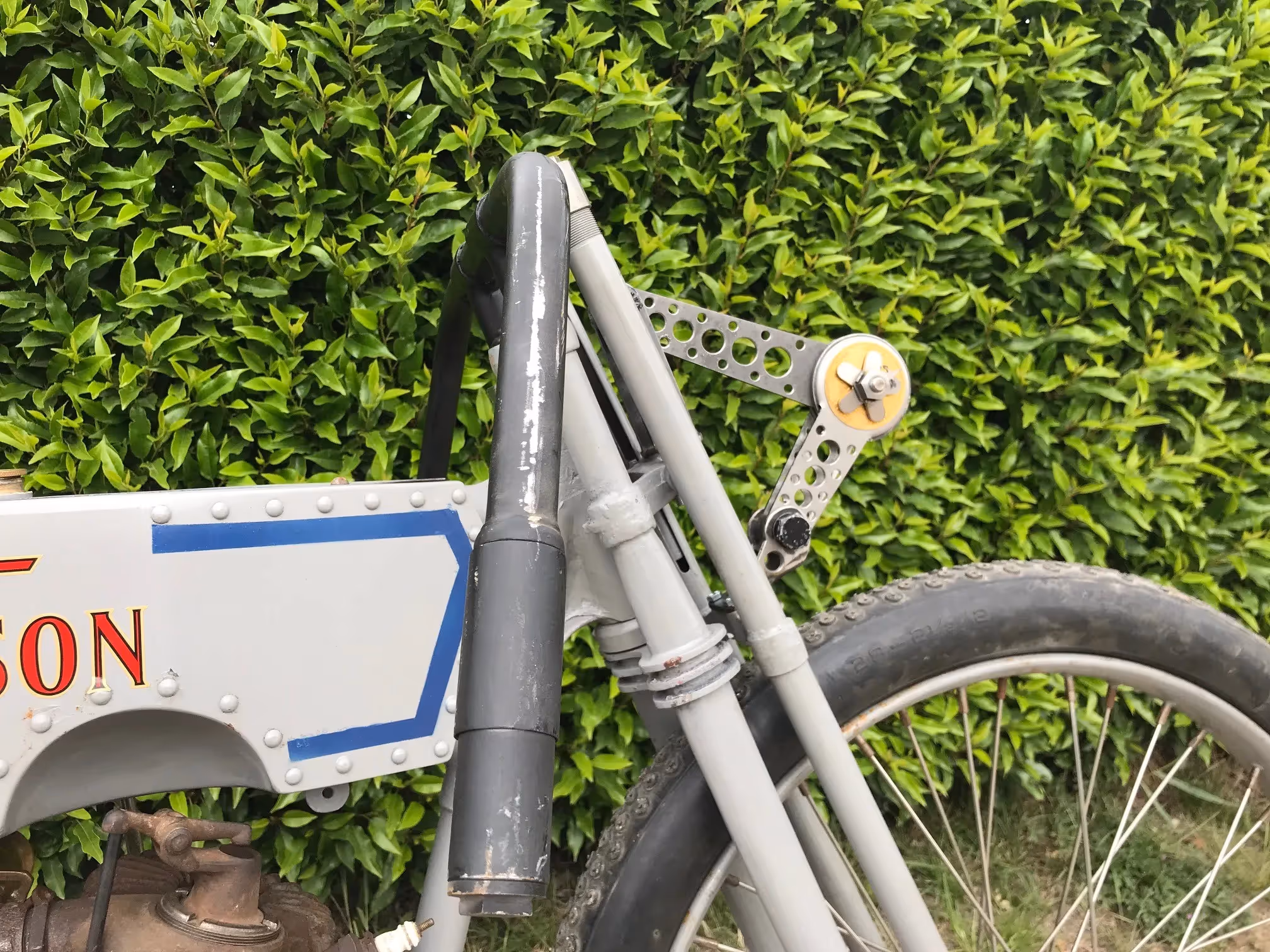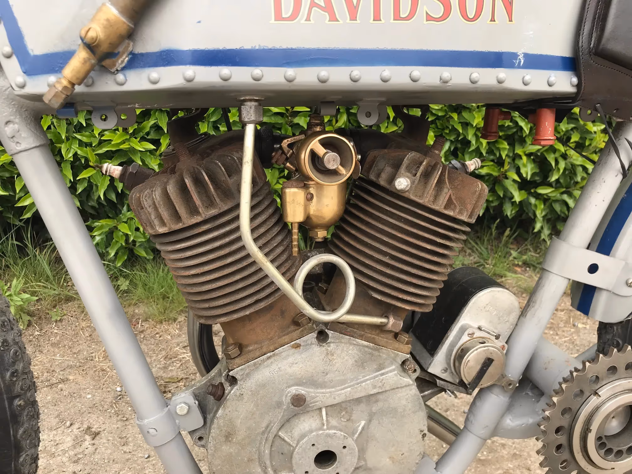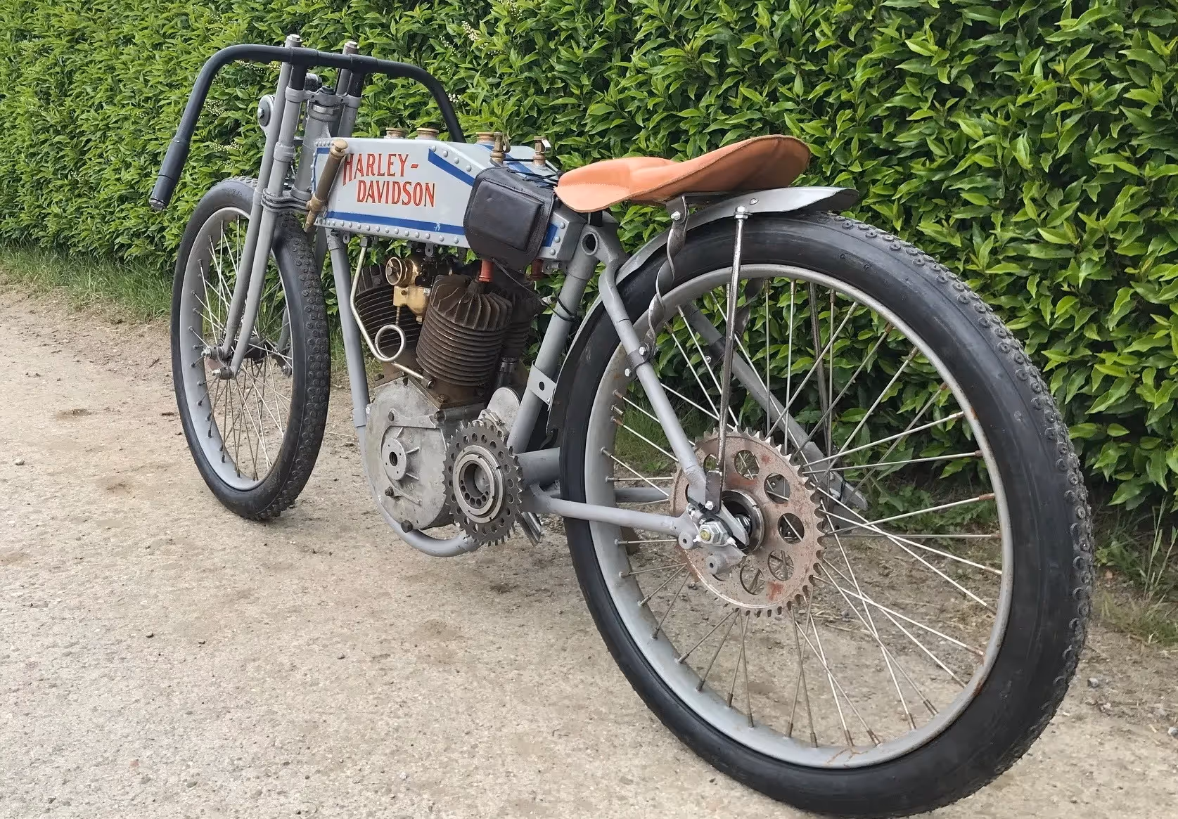 Mooi race project van een Harley-Davidson "rivet tank" racer 1915. In 1915 starte Harley officieel met het fabrieks race team. Dit was het model dat ze gebruikte om te racen. Zonder trapstel maar met een kettingoverbrenging naar het achterwiel. De tank was een aangepaste verstevigde gereveteerde tank. Men had nog keuze uit de vaste voorvork en de geveerde voorvork zoals deze. Motor is compleet. Nieuwe Croker racebanden.