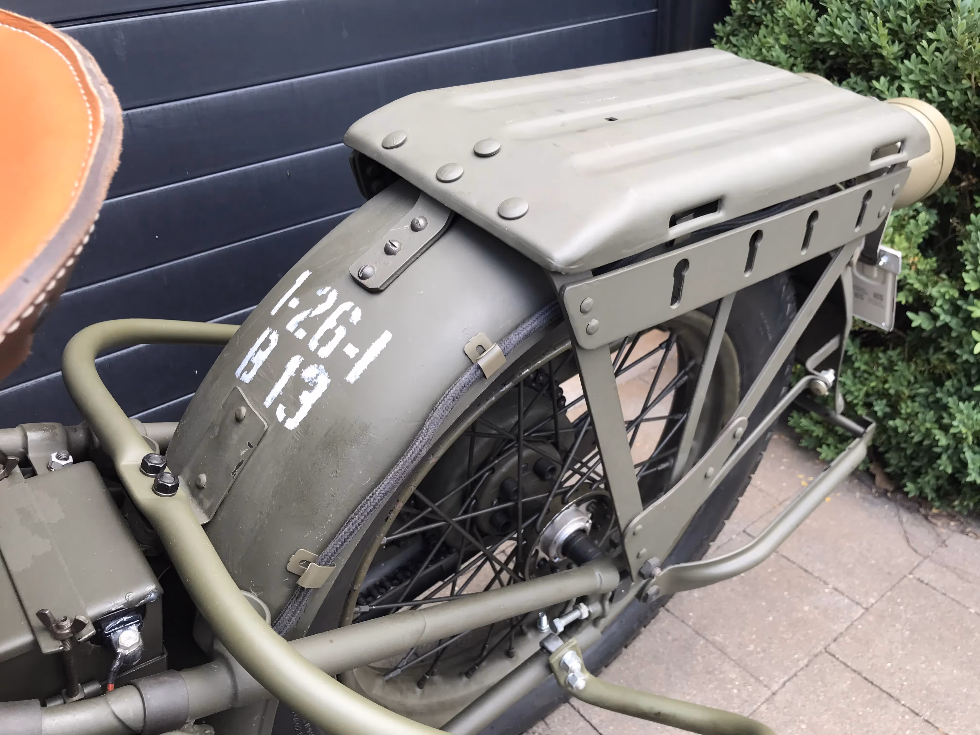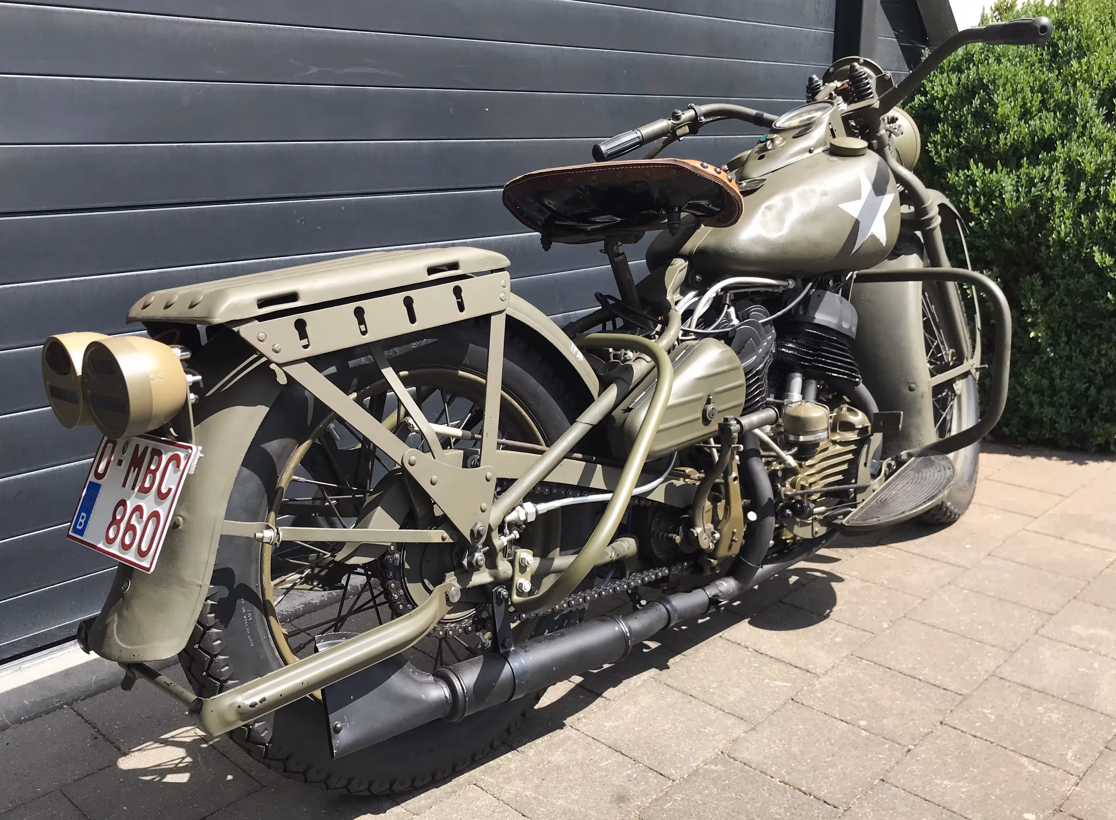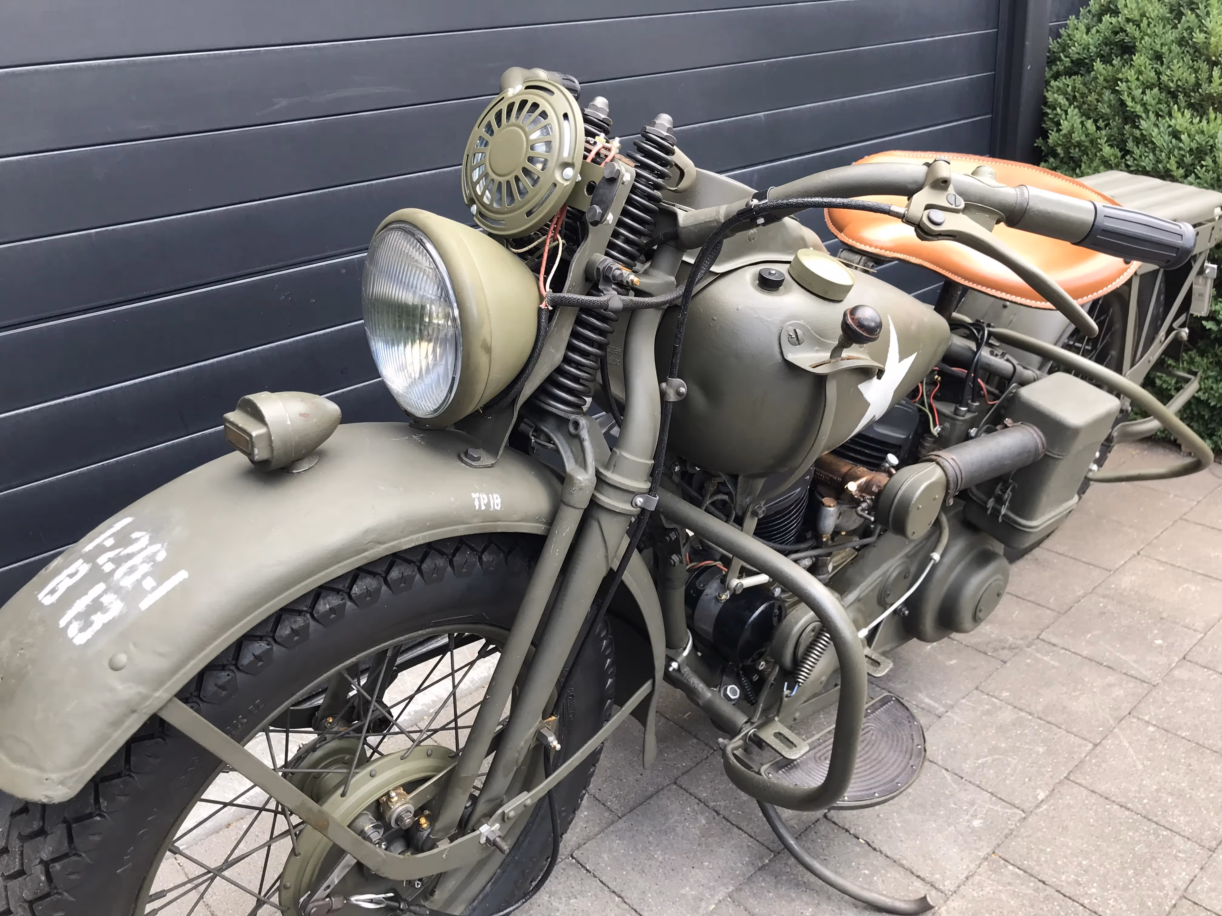 Amerikaanse Harley-Davidson WLA type VI. Dit is een 750cc sv van 1944. Dit model is gemaakt in Juni 1944. Gebouwd volgens de US Army Characteristics of Motor Vehicles (MCM) Nr 9b van 5 Augustus 1943 en volgens contract 11-022-ORD-381. Deze motorfiets had het US army nummerplaat W6111139.