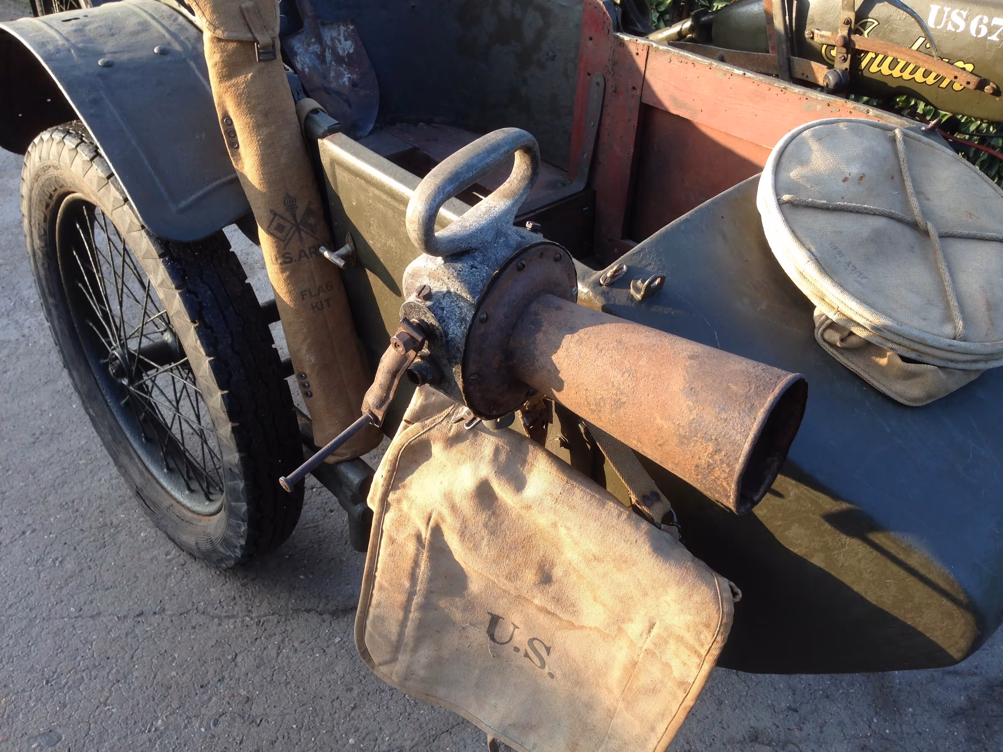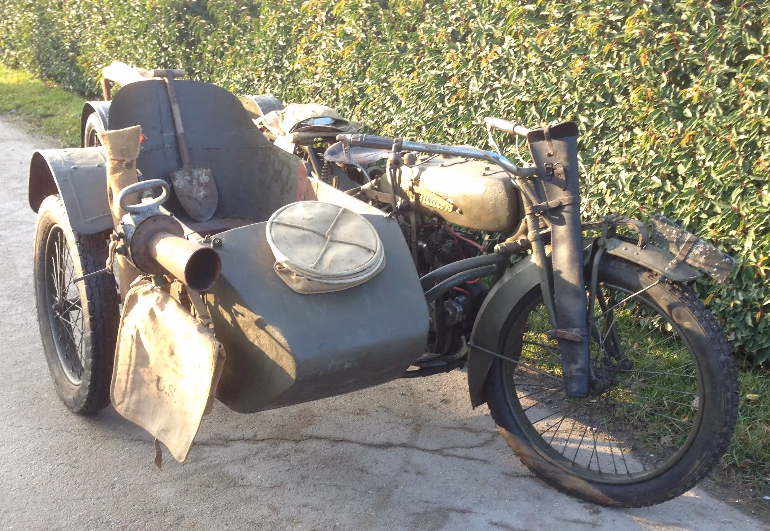 Moto is in Frankrijk door mij na meer als 40 jaar uit de schuur gehaald. Motor heeft origineel 5000 km gelopen. Start en rijdt maar heeft een groot onderhoud nodig. Zijspan is het originele legerzijspan en aanhanger is een originele munitie aanhanger. Alle bijhorende attributen zijn origineel US army en bijna alle gemerkt 1917 of 1918. Sirene is een originele gas alarm sirene gemaakt door Steward die ook bekend is van de oude kilometertellers.