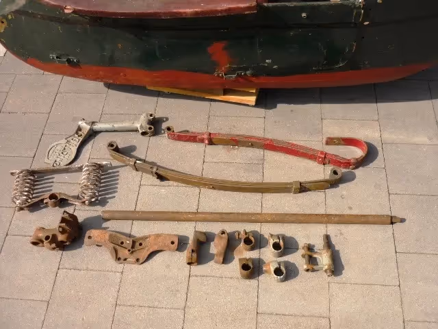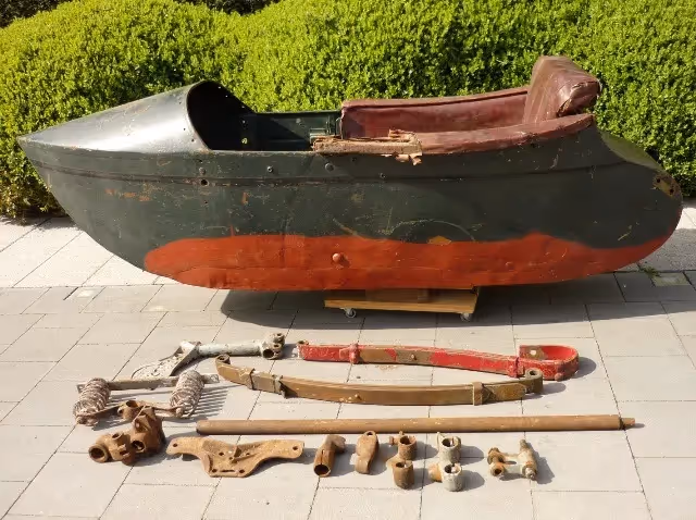 Deze originele bak is compleet met armleuningen en zit. Er zijn nog vele onderdelen bij van het frame maar het frame zelf ontbreekt.