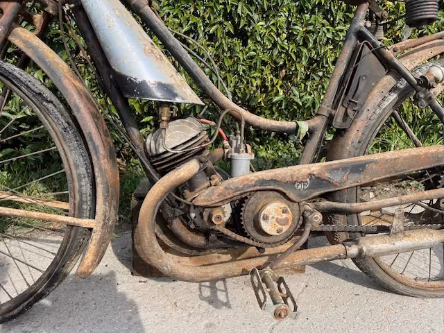 Franse Monet Goyon model M11D. Dit is een 100cc pastoor of vrouwen model met 2 versnellingen en dubbele uitlaat.