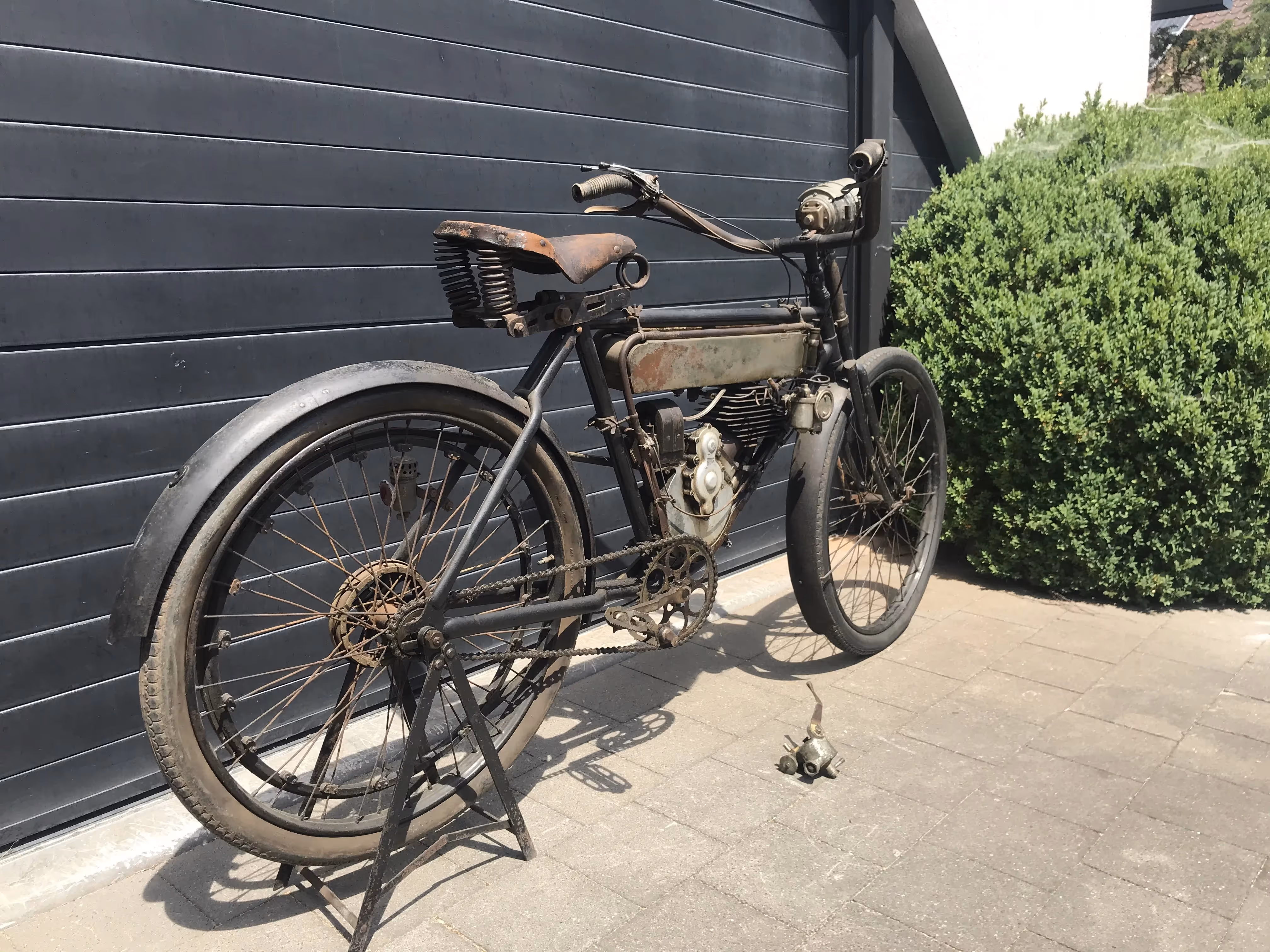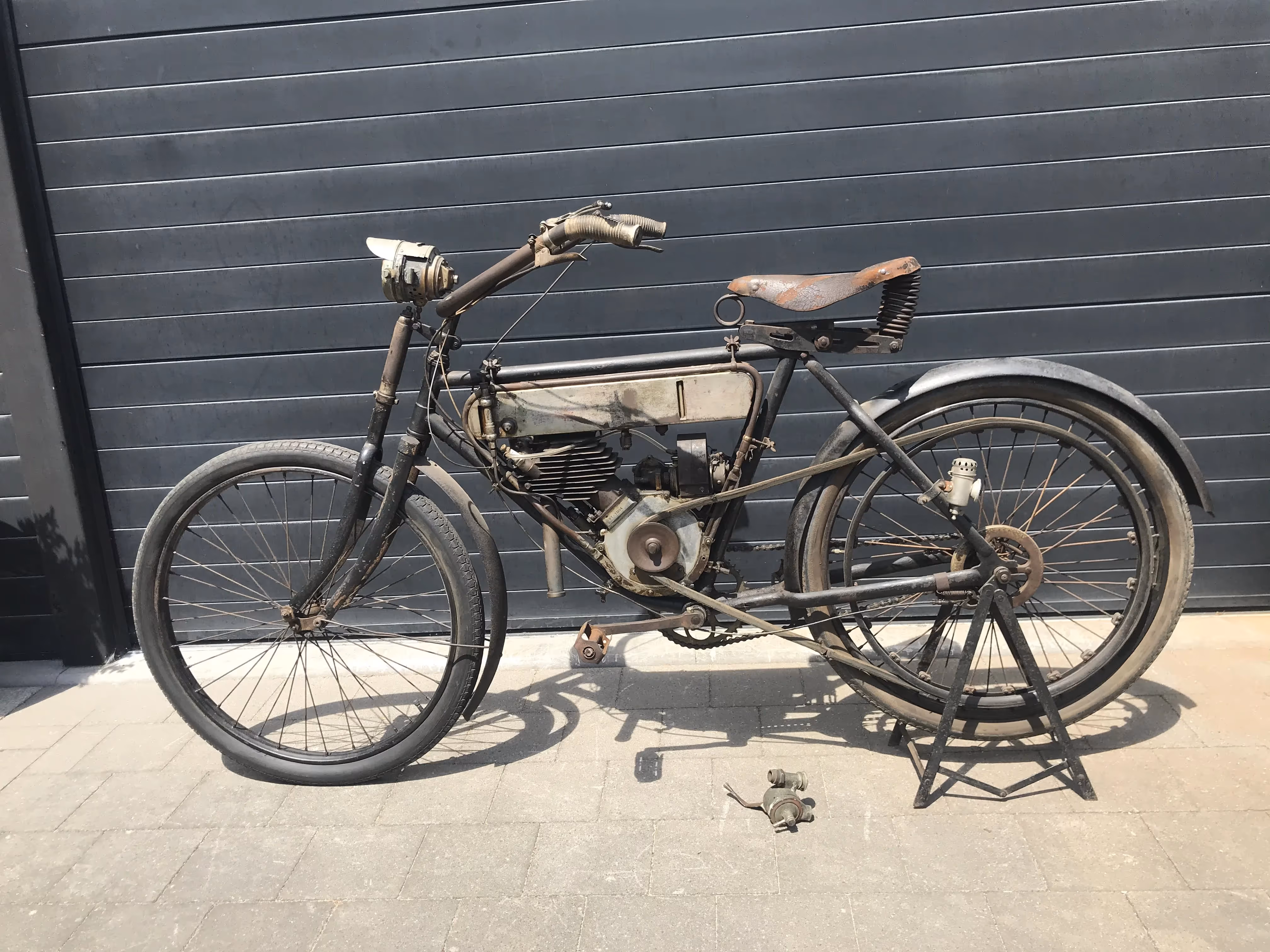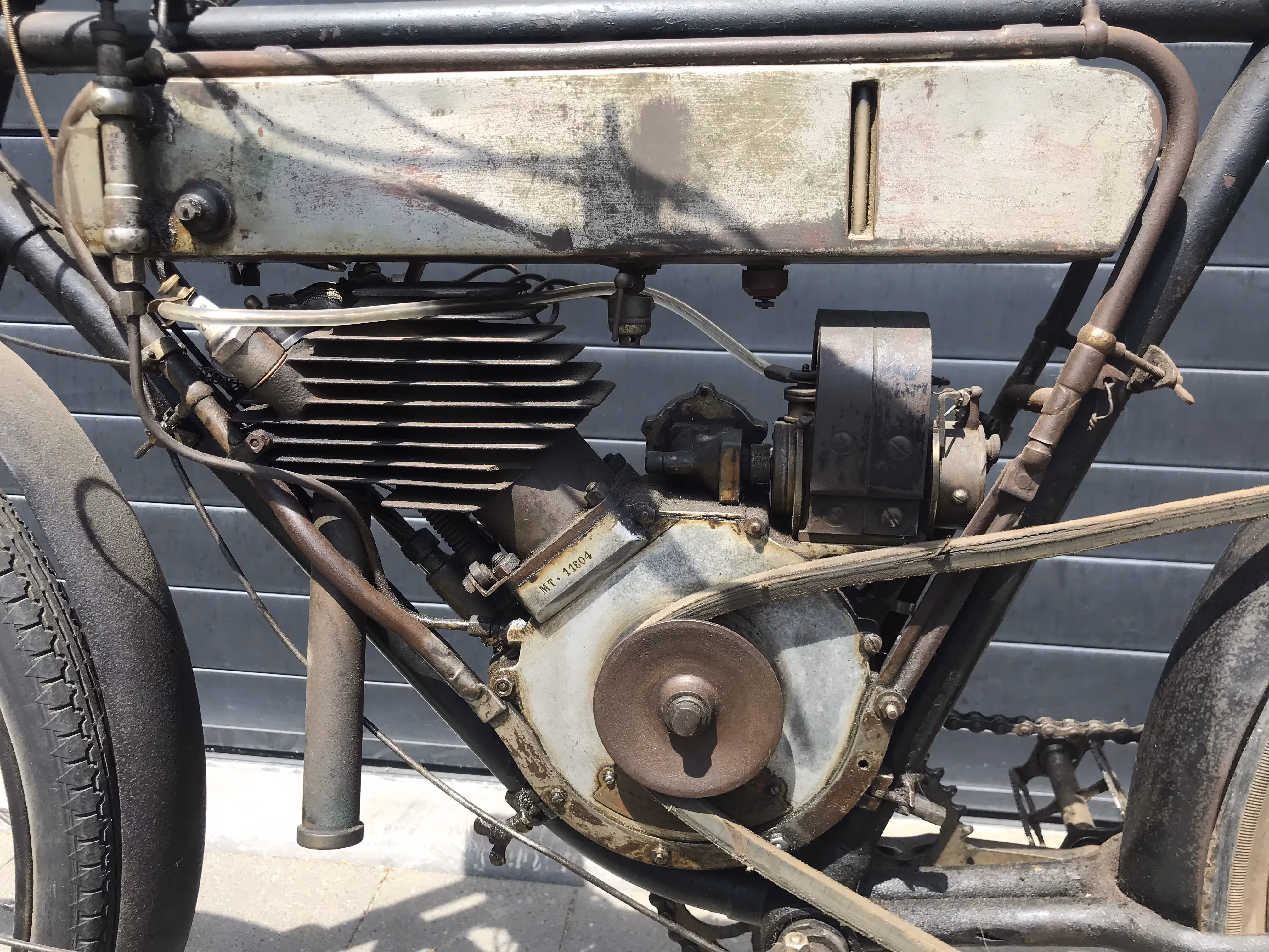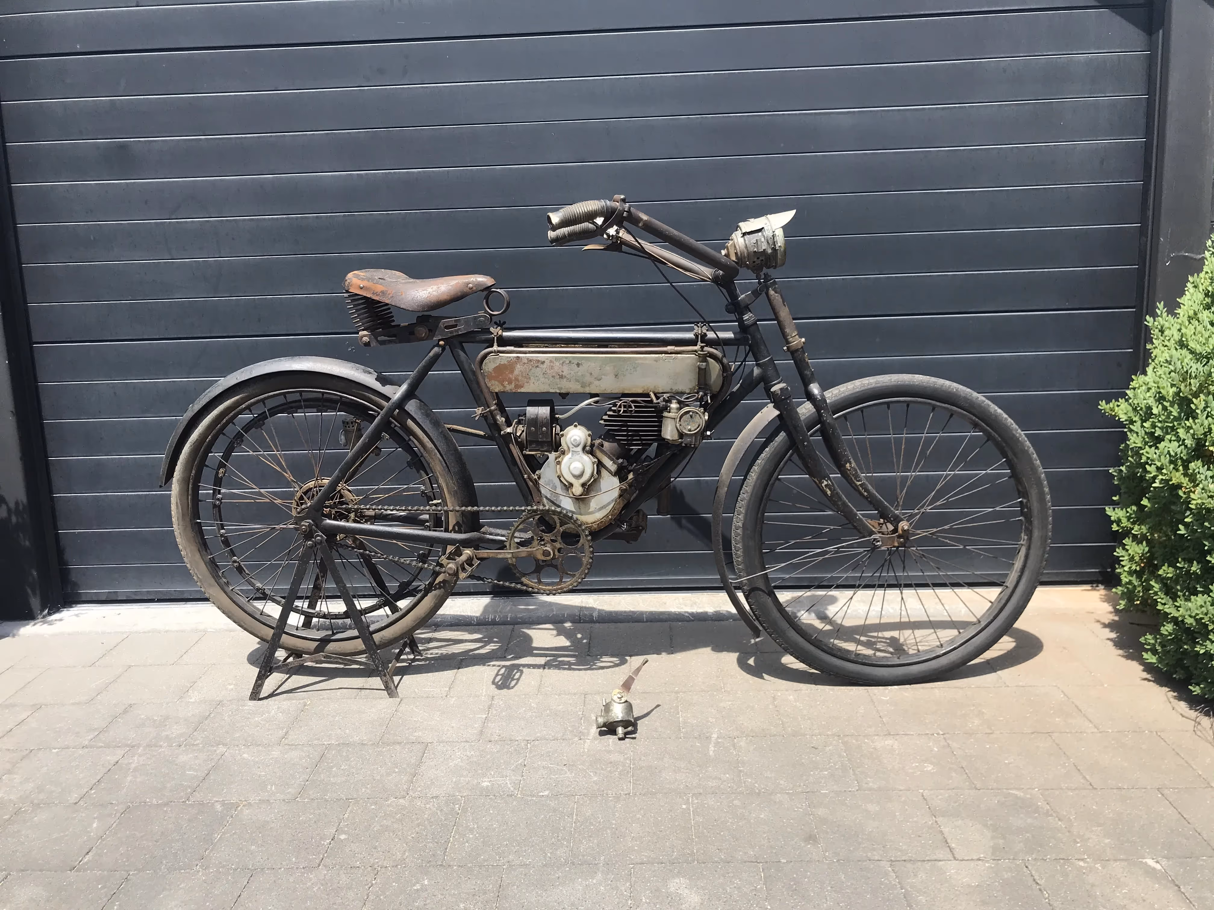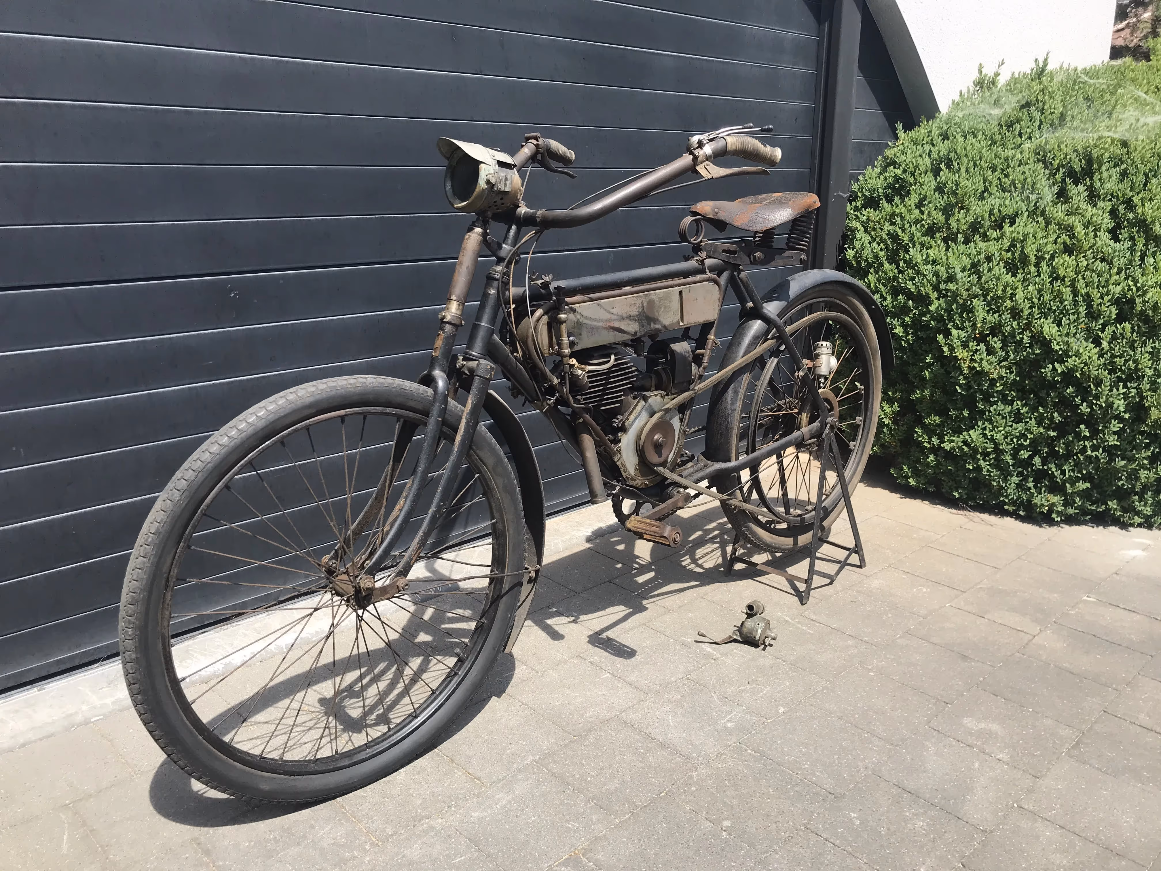 De hier aangeboden Motosacoche model A1 225cc van 1908 is in mooi originele staat en is niet in een gewone fiets ingebouwd maar in het speciaal door Motosacoche gemaakte motorfiets frame. Er staat een iets jongere carburateur op de motor maar de originele is erbij.