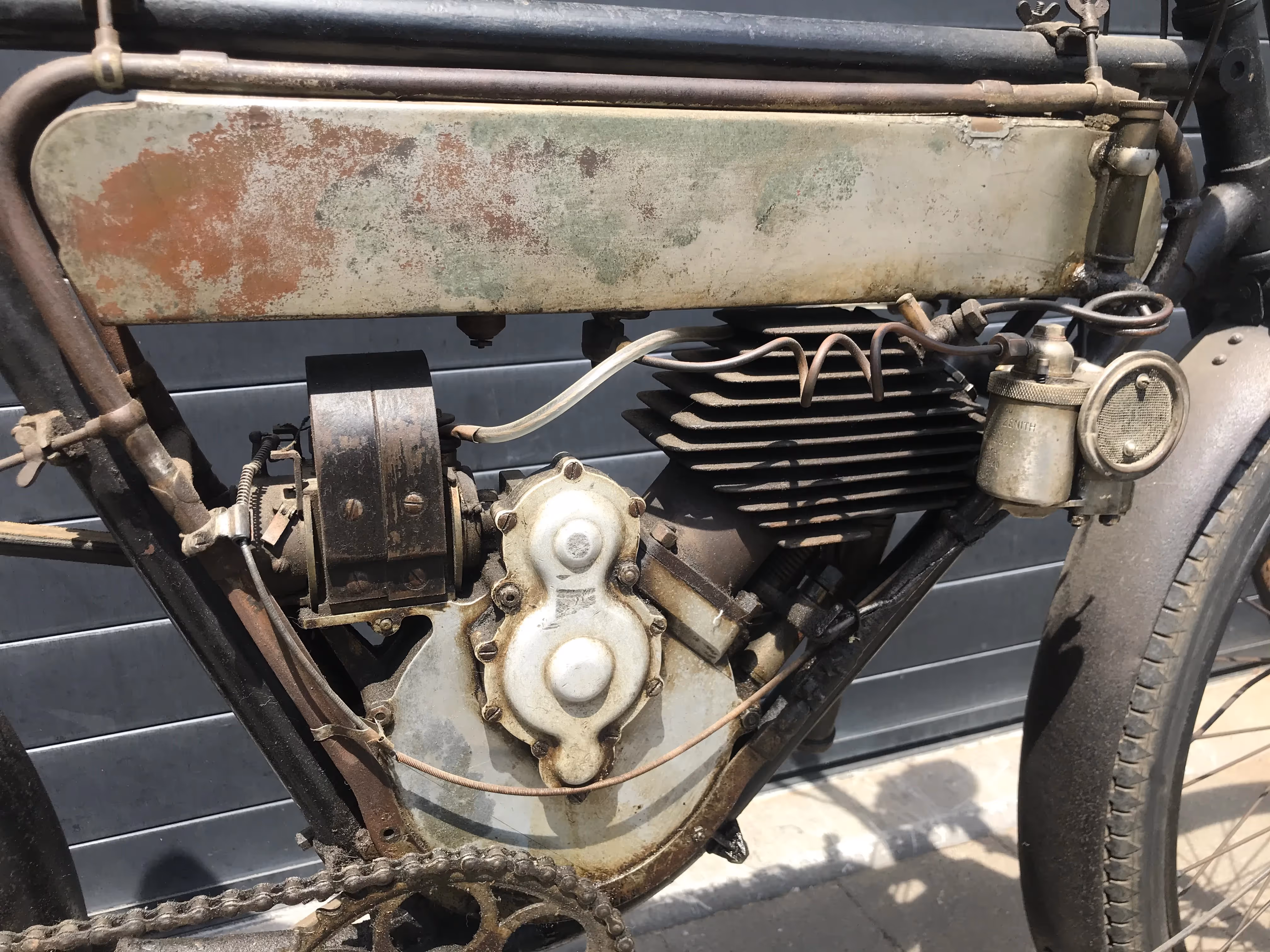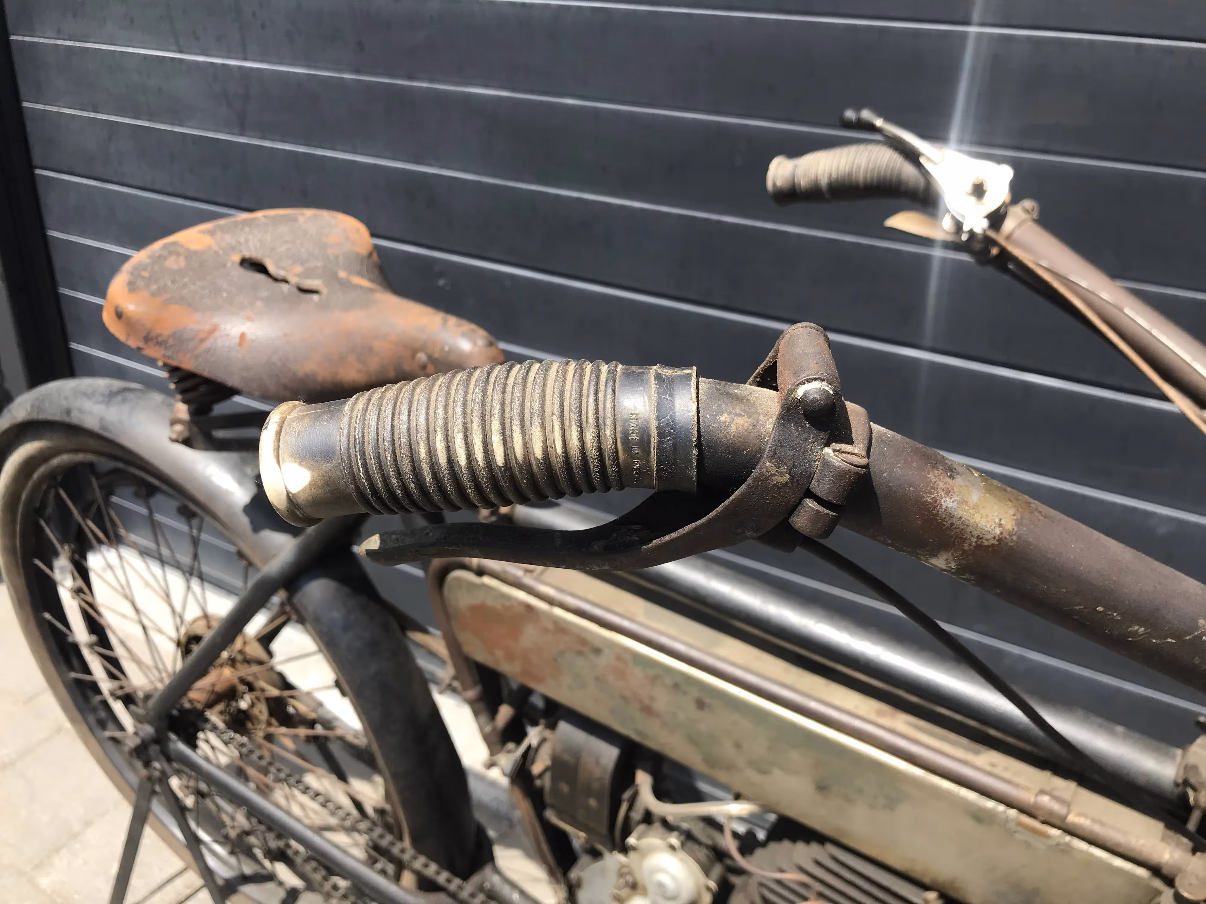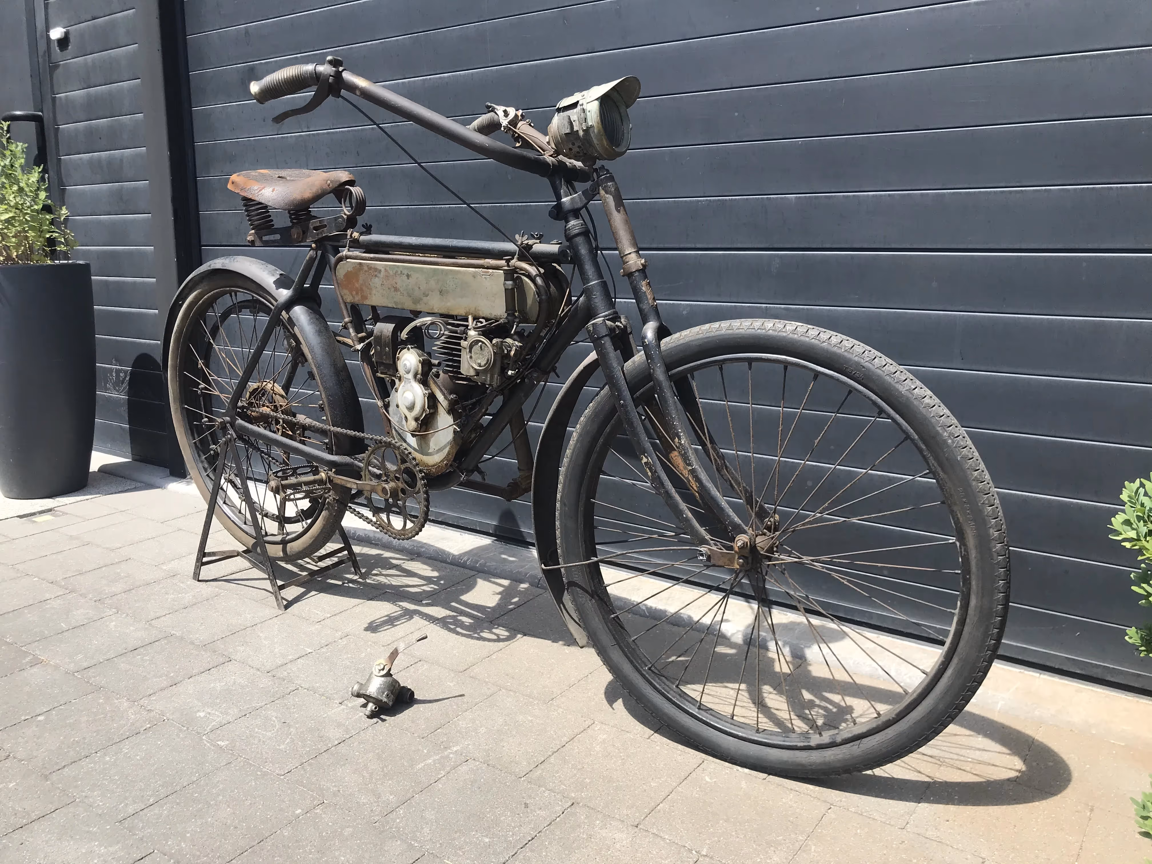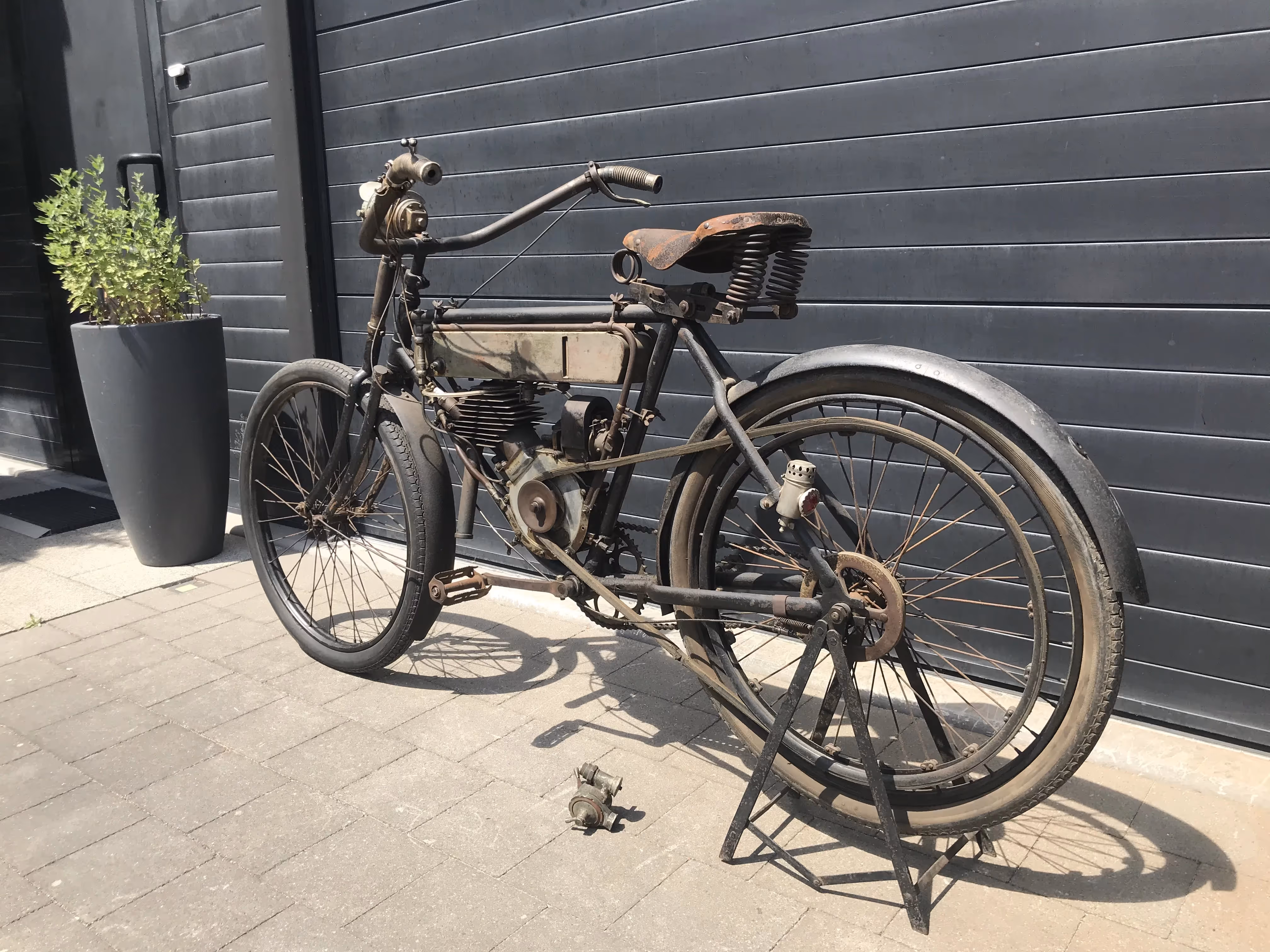 De hier aangeboden Motosacoche model A1 225cc van 1908 is in mooi originele staat en is niet in een gewone fiets ingebouwd maar in het speciaal door Motosacoche gemaakte motorfiets frame. Er staat een iets jongere carburateur op de motor maar de originele is erbij.