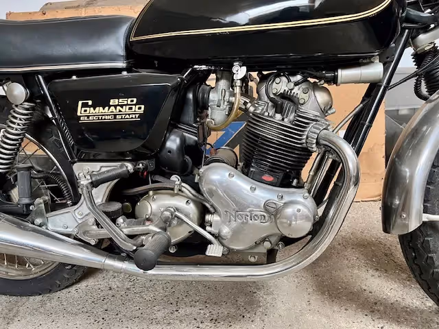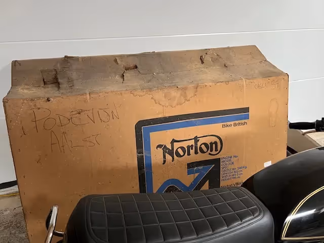 In 2010 werd de nalatenschap van de Belgische motorfiets handelaar Podevyn geveild door veilinhuis Troostwijk. In deze winkel inboedel stonden 11 motorfietsen nog in de krat. Nooit verkochte motorfietsen, splinternieuw! Dit is er zo eentje. De Norton Commando 850cc van 1978. Motorfiets is uit de krat gehaald en de krat is behouden samen met alle bevestigingsmateriaal (zie kist). Op de motorfiets zitten alle nieuwe stickertjes zoals hij geleverd is. Motorfiets is nooit gestart. Een echte tijdscapsule van deze prachtige Norton.