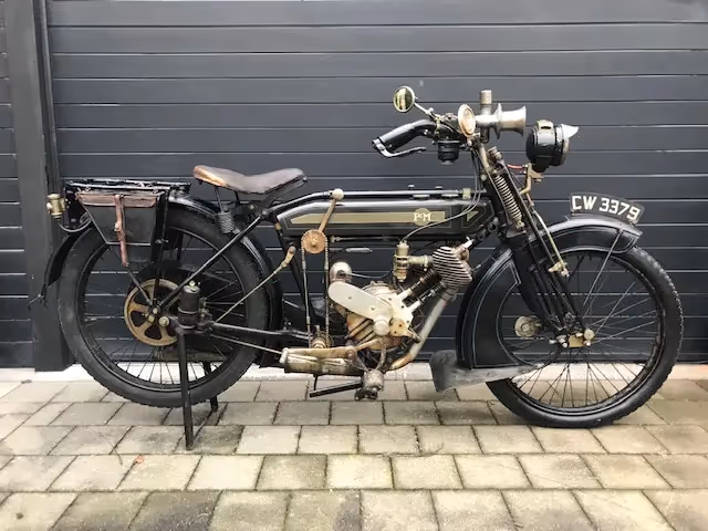 Motorfiets is volledig origineel. Kijk eens naar de benzinetak, volledig origineel en ongerstaureerd, ongelofelijk om motorfietsen van meer als 100 jaar oud in deze toestand te vinden. Zelf de binnenzijde van de tank lijkt zo uit de winkel te komen 100 jaar geleden. Verder is deze motorfiets voorzien van een volledige set Lucas carbuur verlichting, de speciale smalle luchtpomp boven op de tank, Cowey toeter.