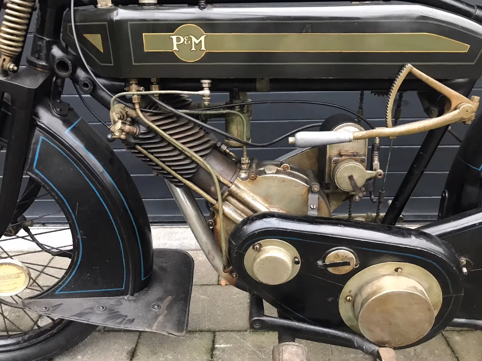 Phelon & Moore was een motorfiets fabriek die gestart is in 1904 in Cleckheaton in South Yorkshire. Hun handelsmerk was de schuine cilinder die deel uitmaakte van het frame. Een van de eerste ontwikkelingen die zij maakte was de 2 versnellingen door gebruik te maken van 2 primaire kettingen. Met de handle op de rcechterzijde van de tank kan men achteruit eerste versnelling kiezen, midden neutraal en vooruit was 2de versnelling. Dit alles zonder een echte versnellingsbak en zonder tandwielen. Verder een zeer moderne motorfiets met volledig ingesloten ketting en zelfs een handrem (rechterzijde), zeer handig bij zijspan gebruik. Motorfiets komt met Engels inschrijvingsbewijs en origineel nummerbord van Burley.