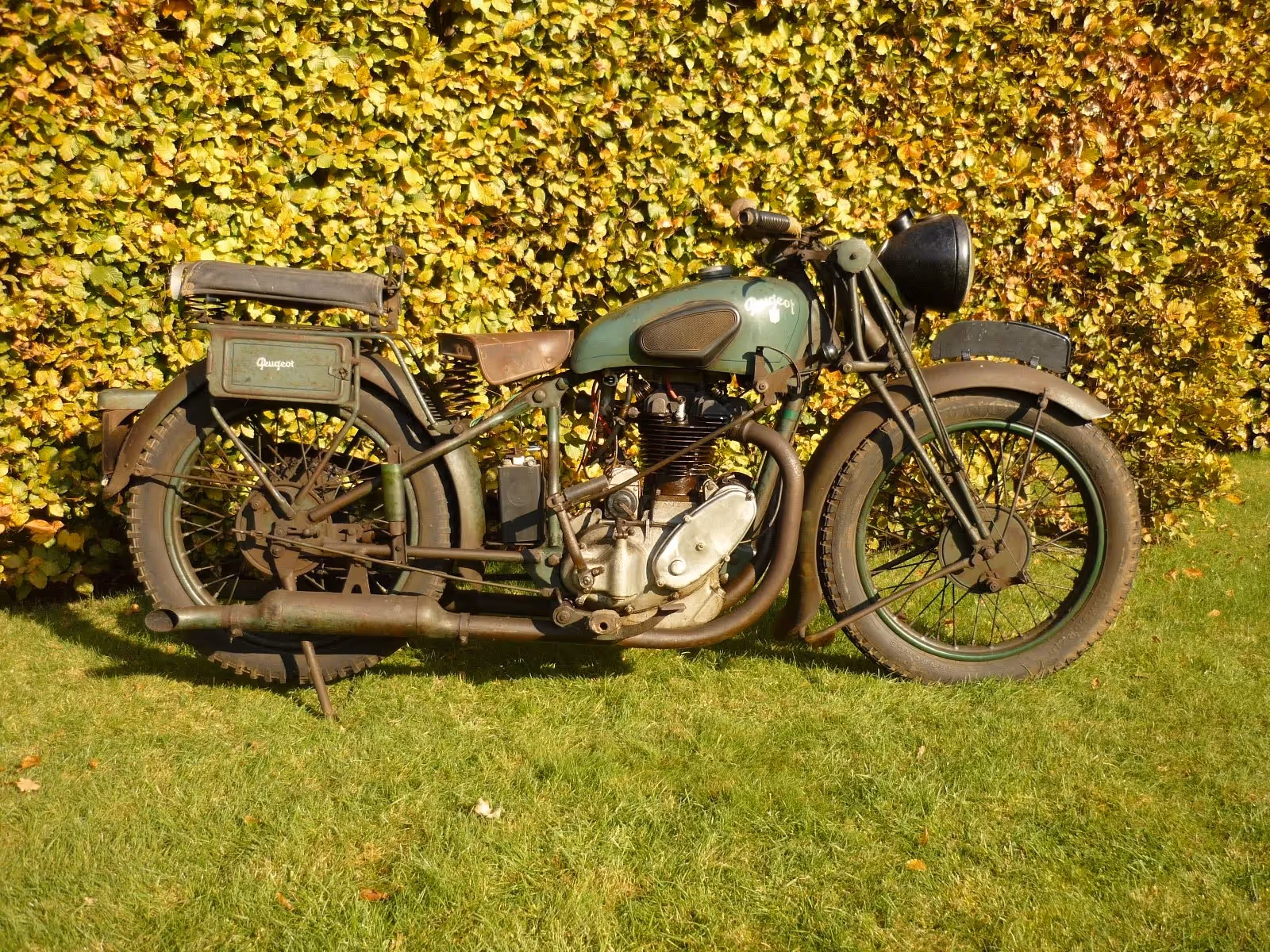 Franse Peugeot P135 Grand Sport. Dit is een 350cc kopklepper met haarspeld klep veren, hoge compressie zuiger en vergroot carter met 2 liter olie extra. In de jaren '30 was men op zoek in Frankrijk achter snellere motoren, motoren met "Grande Puissance" dit naar aanleiding van de vele wedstrijden voor motoren. Hierdoor bracht Peugeot een verbeterde versie uit van de P117. Dit was de P135. Een snelle motorfiets waarvan men een hele snelle versie kon kopen, de Grand Sport. Deze hadden een vergroot carter dat tot tegen het achterspatbord loopt. Hierdoor was er 2 liter meer olie in het motorblok voor betere smering en koeling. Ook hadden deze een bollere zuiger voor meer compressie en om eventueel op alcohol te rijden tijdens het racen. Deze motoren hadden ook de haarspeld veren om de kleppen te bedienen. Dit model zoals hier aangeboden was sneller dan de standaard 500cc kopklepper. De hoge uitlaten zoals op deze was een optie. In totaal zijn er tussen 1936-1940 1080 P135 gemaakt waarvan maar een klein gedeelte deze Grand Sport versie met grotere motorblok was. De hier aangeboden motorfiets is volledig gereviseerd.