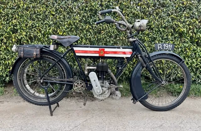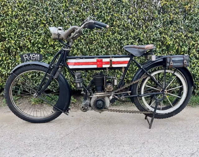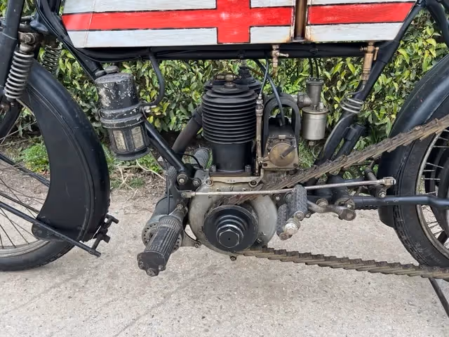 Perfecte motorfiets om pioneer runs mee te rijden doordat deze een koppeling heeft in het achterwiel. Hierdoor moet men niet steeds opnieuw opstarten als men stopt zoals een normale direct aangedreven motorfiets van die tijd. Motorfiets is volledig origineel en in zeer mooie patina. Motor start en rijdt maar heeft wat onderhoud en nazicht nodig want staat al vele jaren stil.