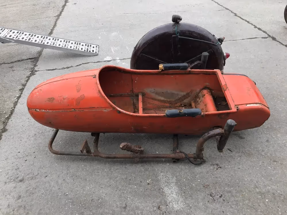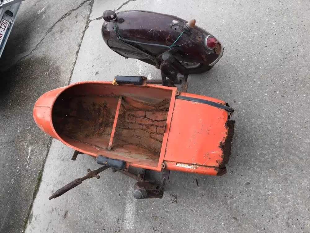 Klein licht zijspan voor scooter of kleine motorfiets. Nu met groot wiel maar was mogelijk om klein zijspanwiel te monteren.