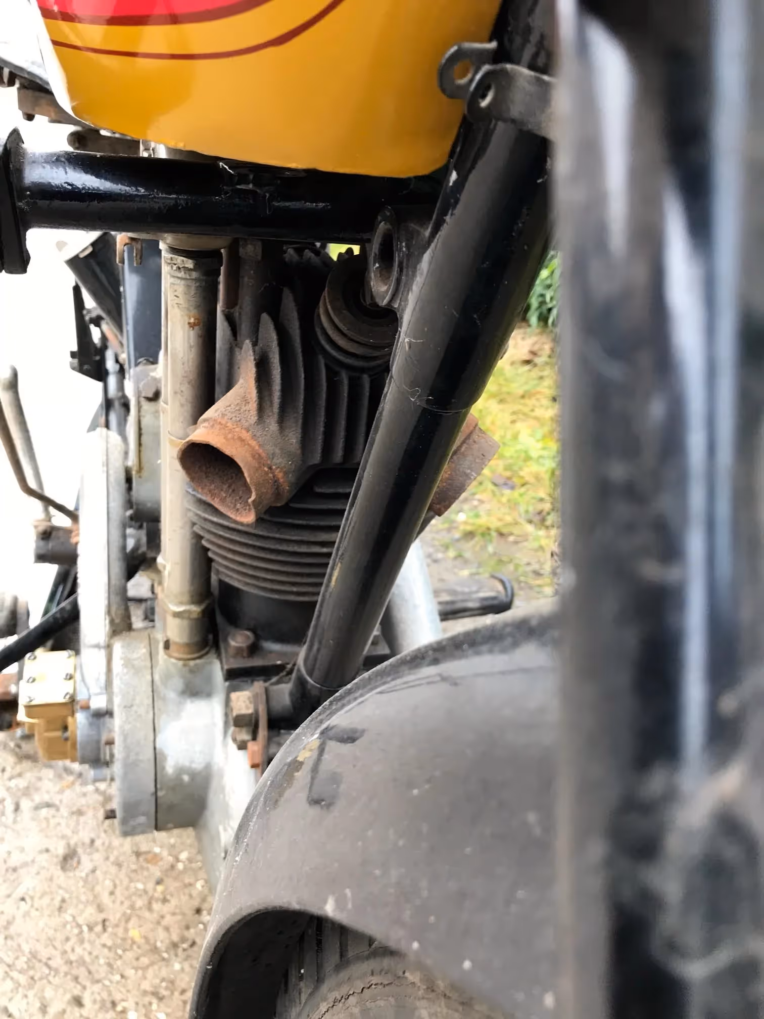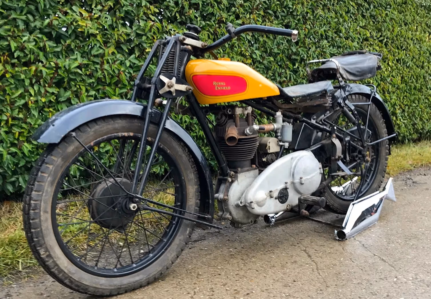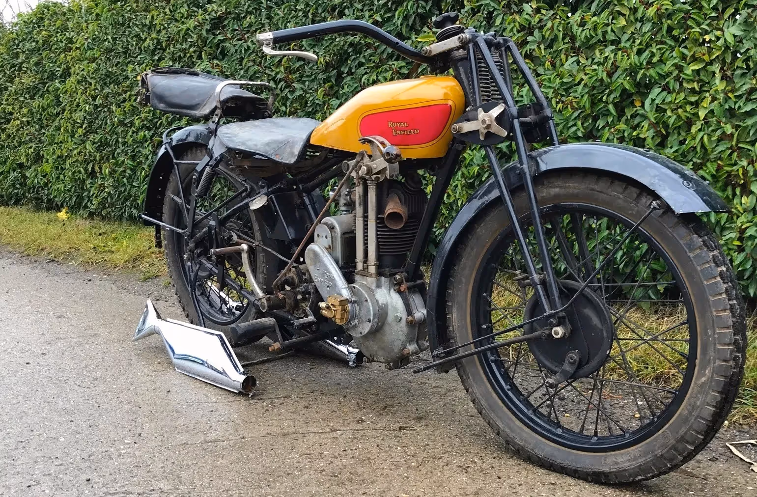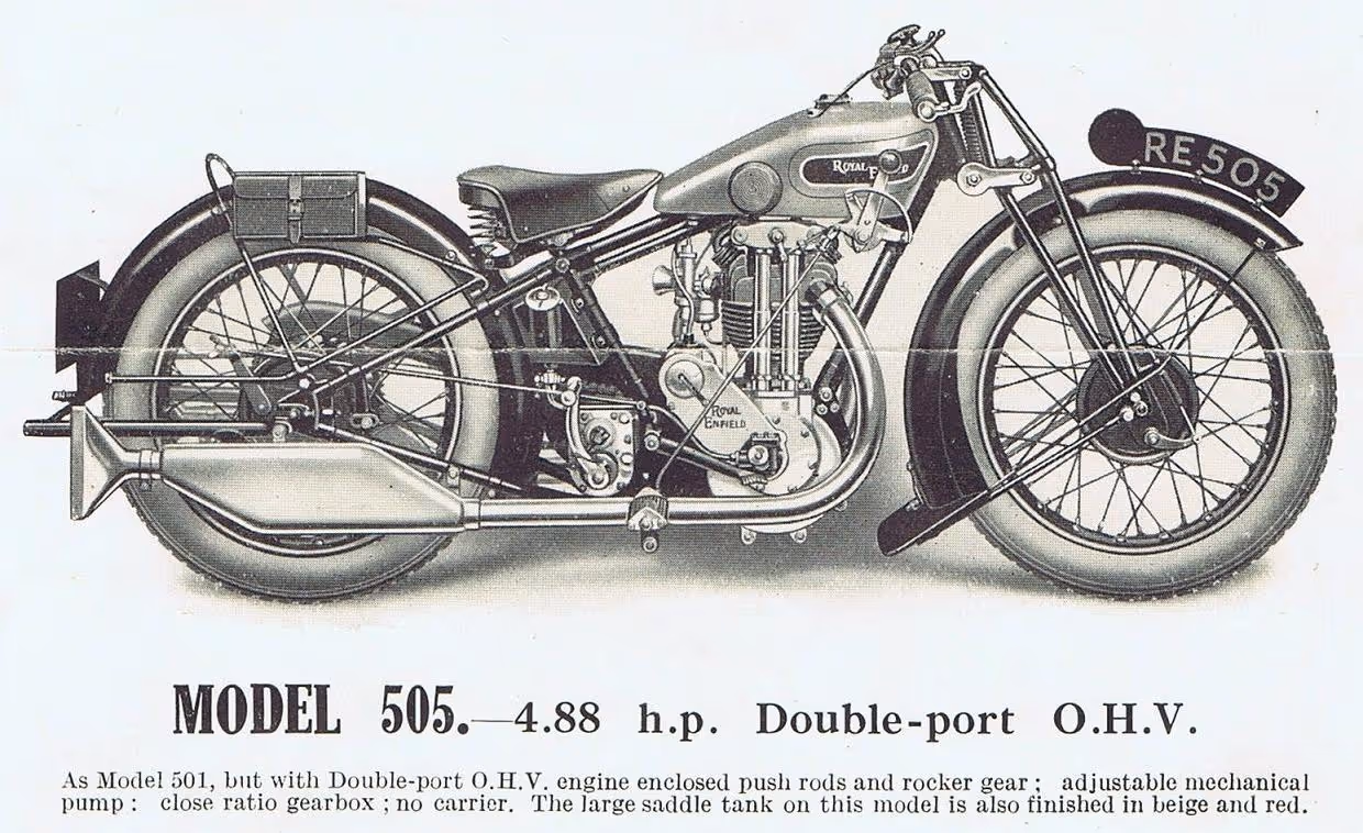 Engelse Royal Enfield 500cc kopklepper met dubbele uitlaat en close ration versnellingsbak. Dit was de sportversie van de normale 500cc kopklepper met enkele uitlaat, model 501. Deze zeldzame sport motor (model 505) is in mooie zo goed als complete staat, motor heeft goede compressie en je kan de versnellingen nemen.