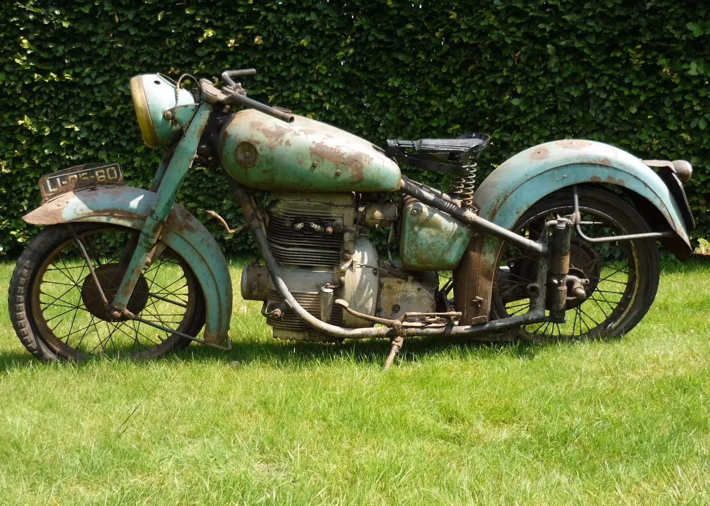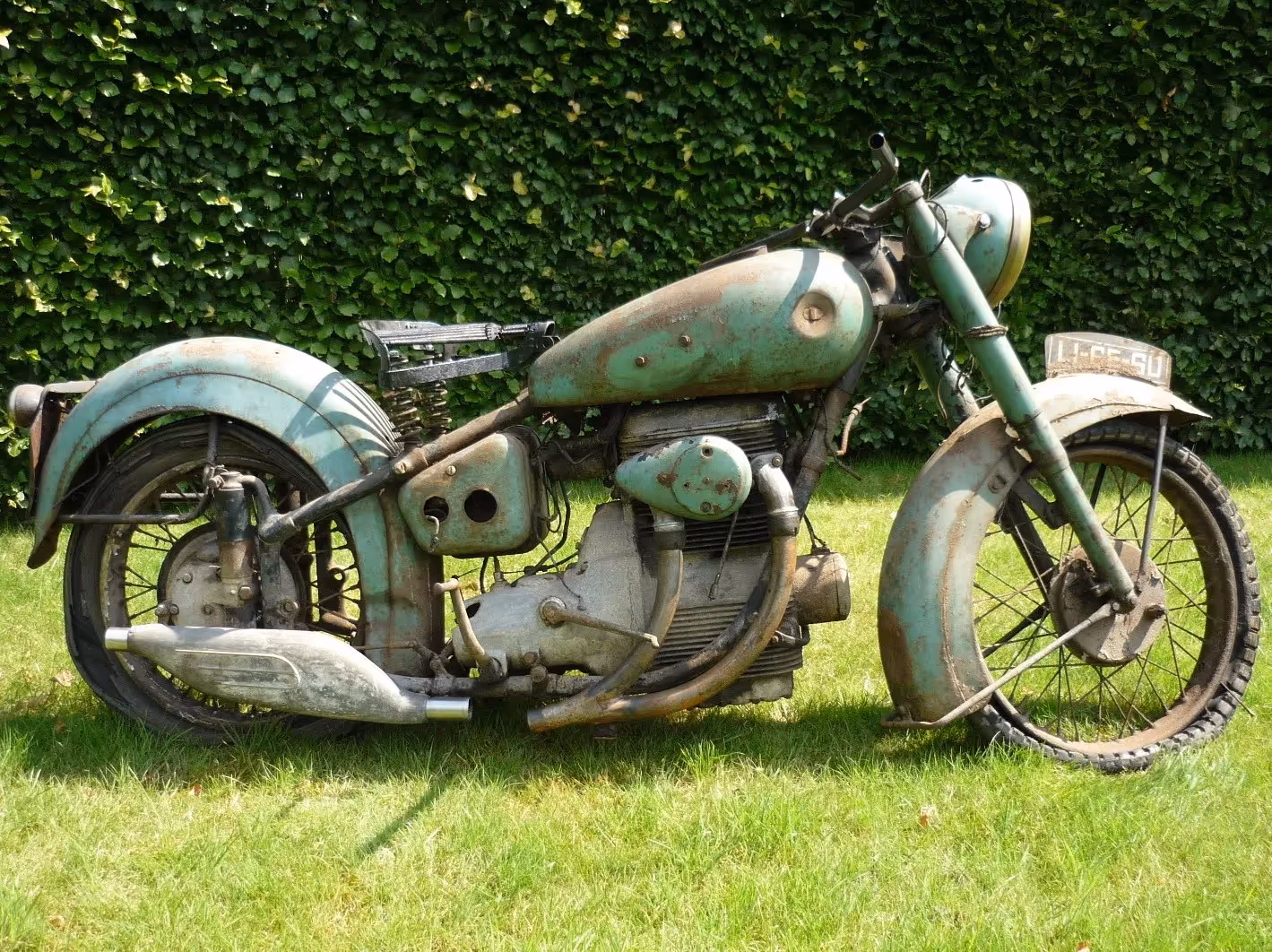 Ongerestaureerde originele Engelse Sunbeam model S8. Dit is een 500cc 2 cilinder in lijn met bovenliggende nokkenas en karden aandrijving.