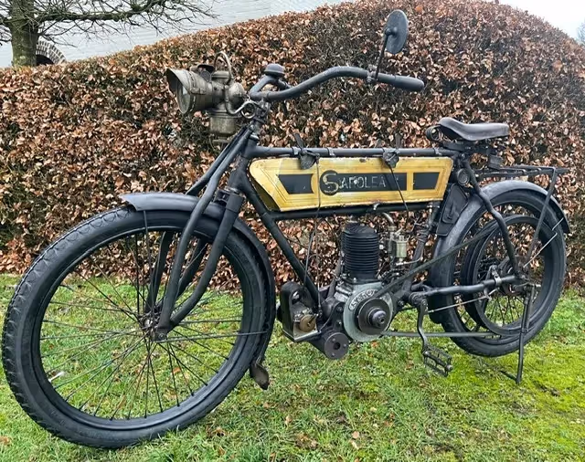 Belgische Saroléa van 1905. Dit is een 440cc in perfect rijdende staat.