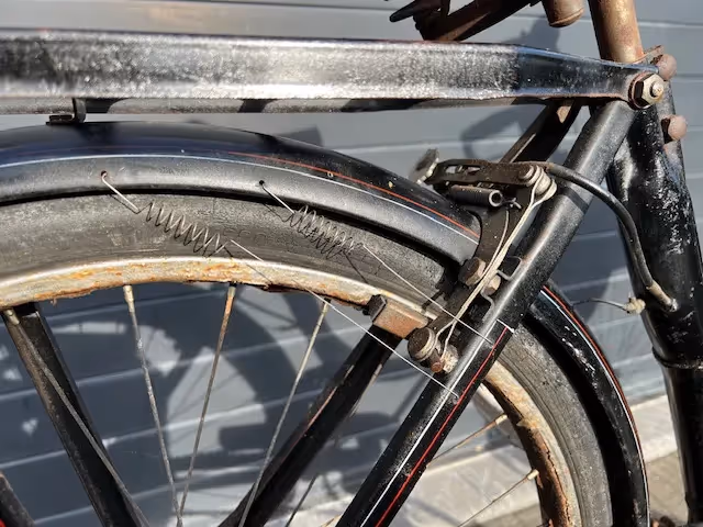 Mooi origineel met alle biezen er nog op en met het materiaalbakje achteraan dat meestal weg is.