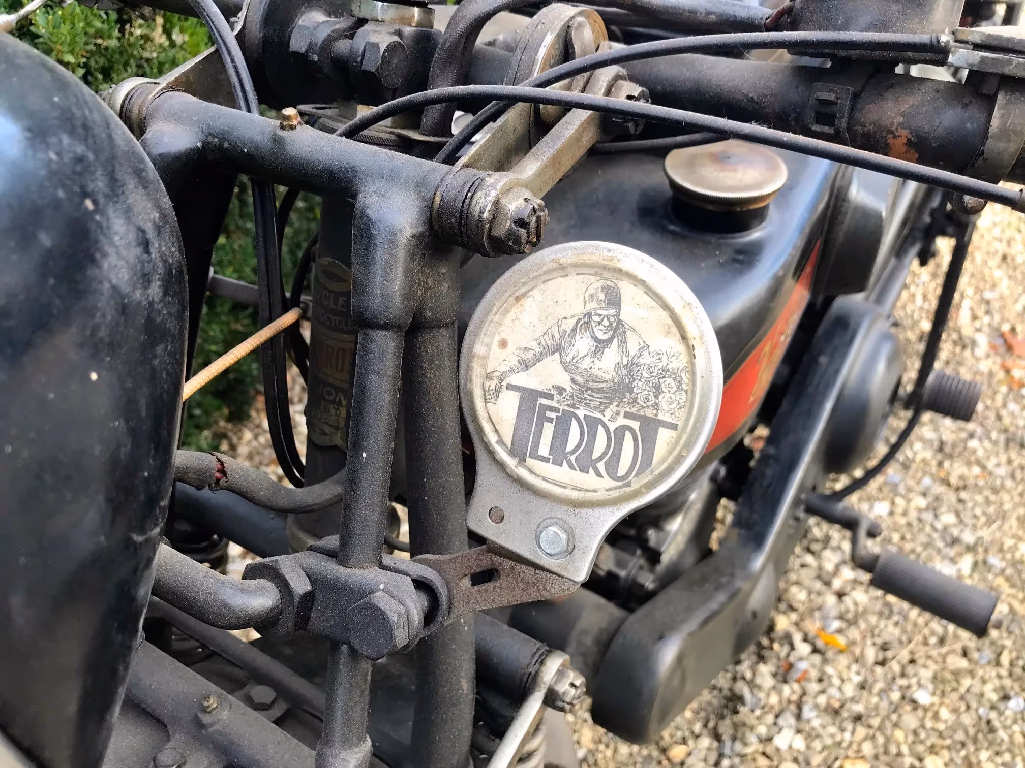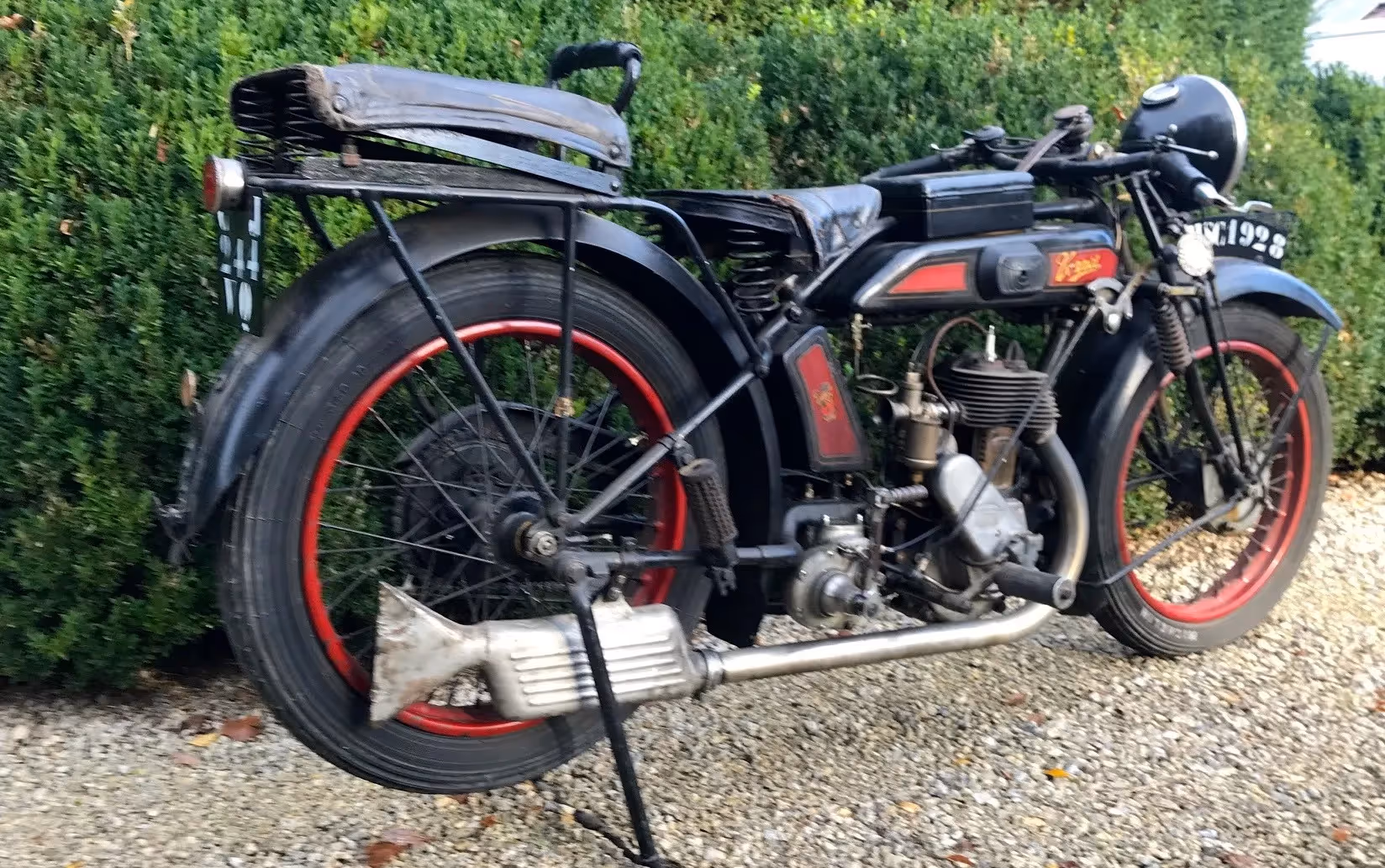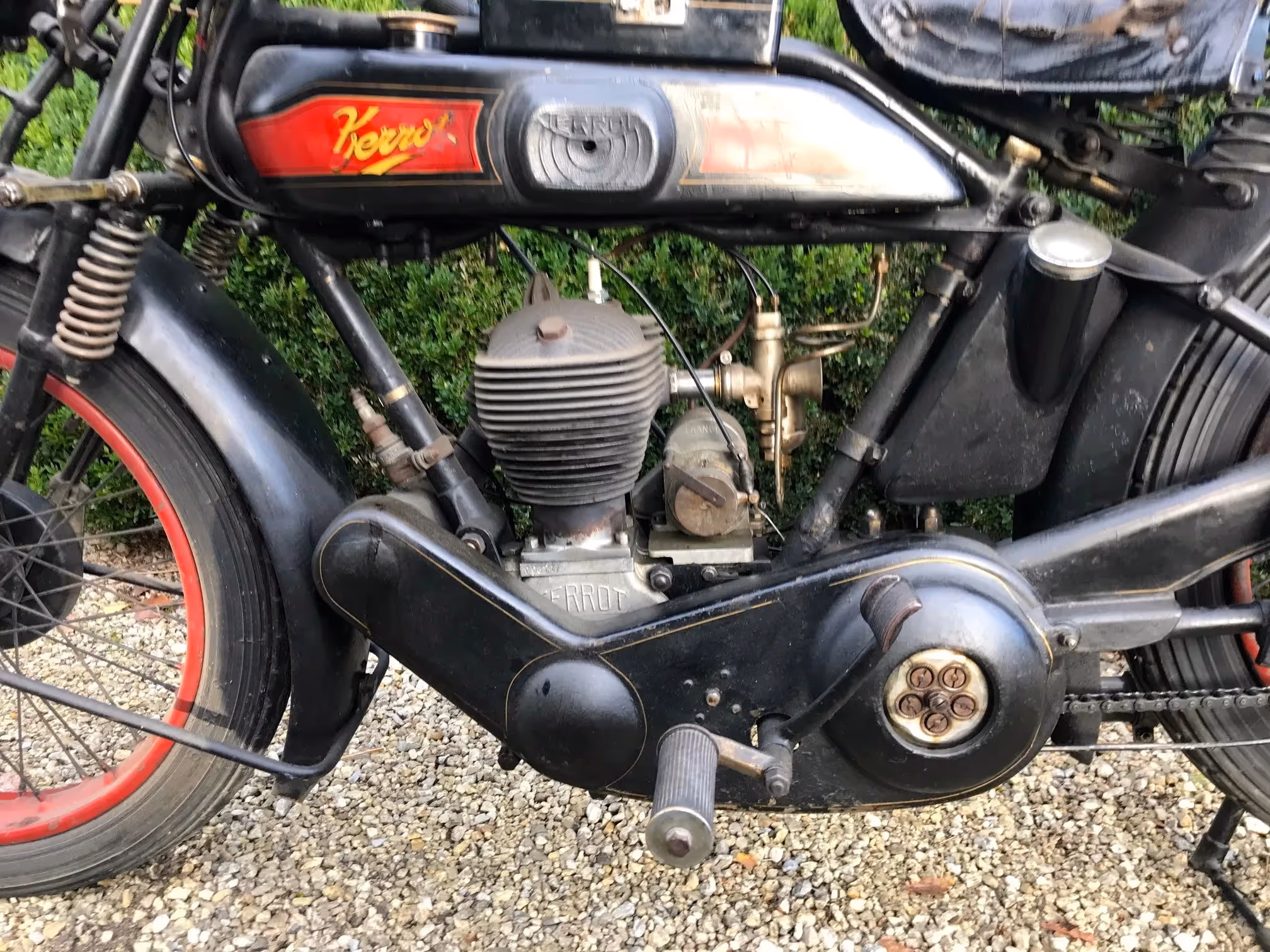 Franse Terrot model HSC. Dit is een Sport Confort 350cc zijklepper van 1928 in mooi originele staat. Dit is het laatste jaar van de flattankers. Vanaf 1929 zijn de modellen stilaan overgeschakeld naar zadeltank modellen. Dit is nog het mooie model met oliedruppelaar in de tank. Motor start en rijdt maar heeft eens een goed onderhoud/nazicht nodig.