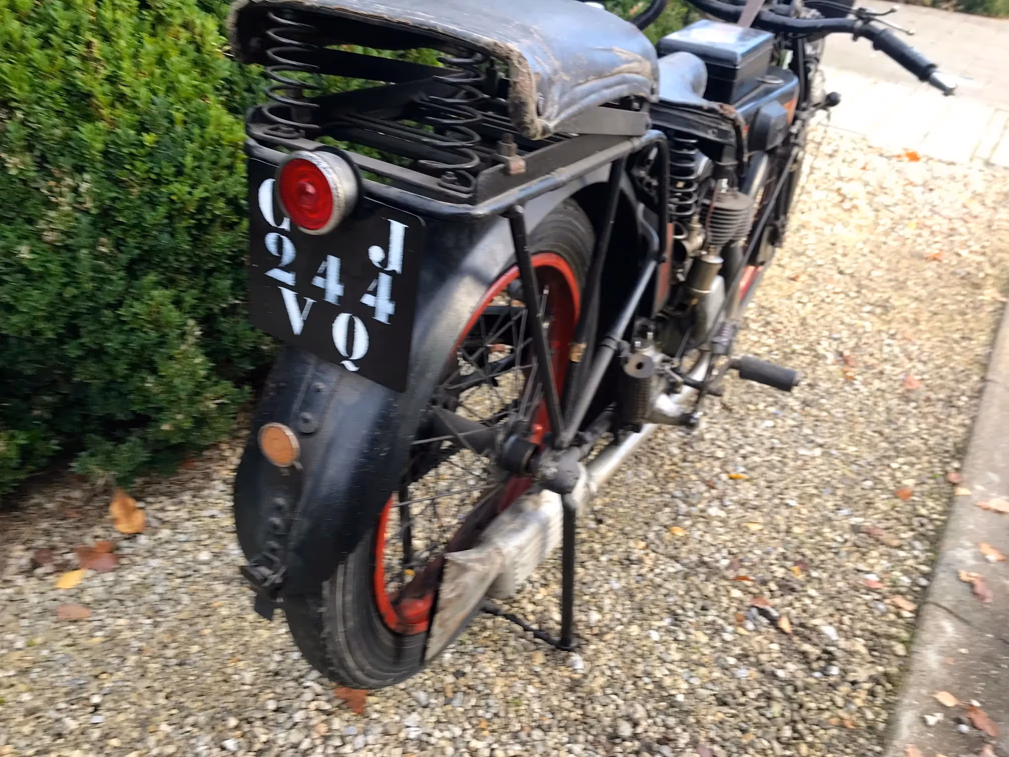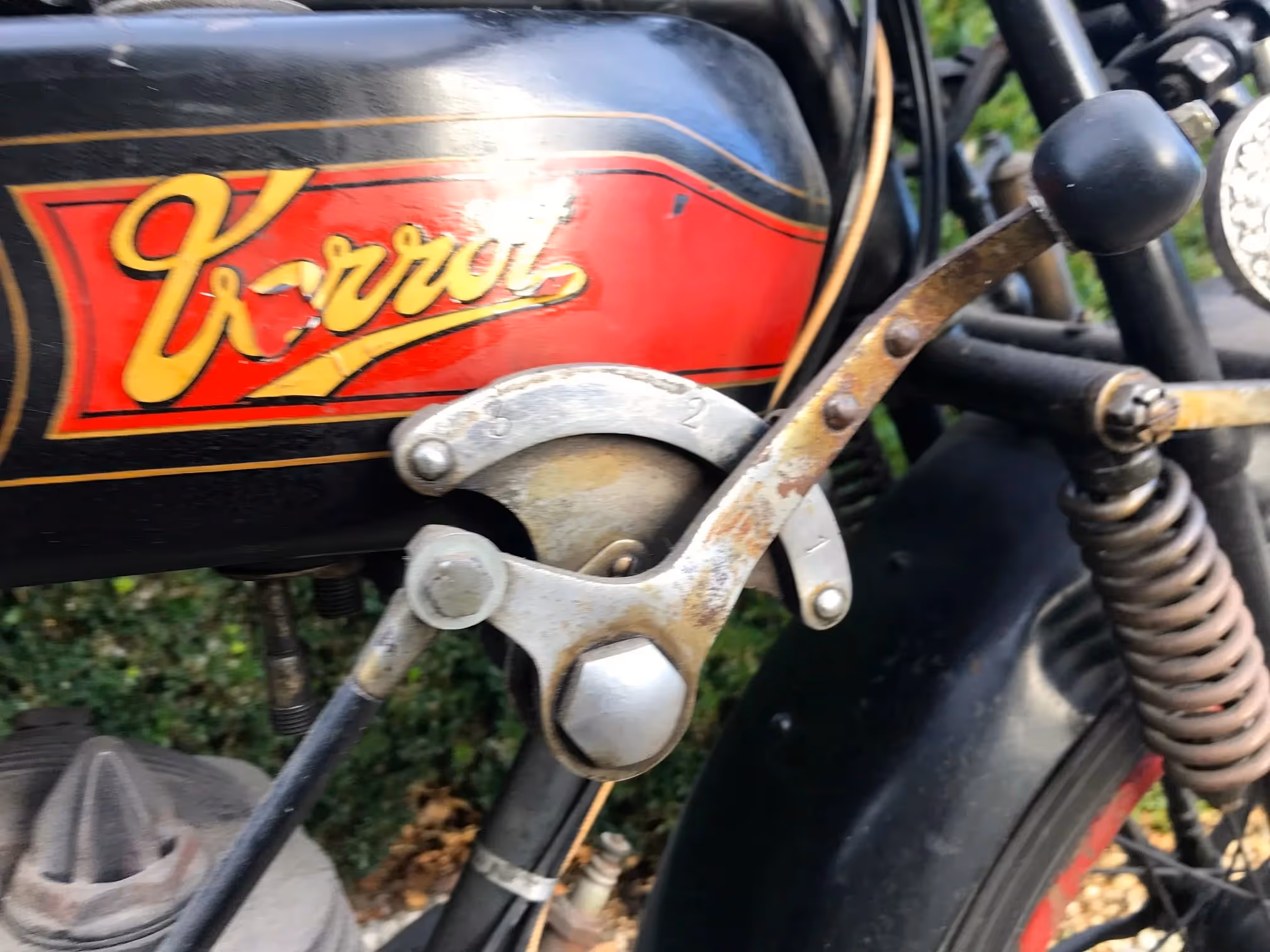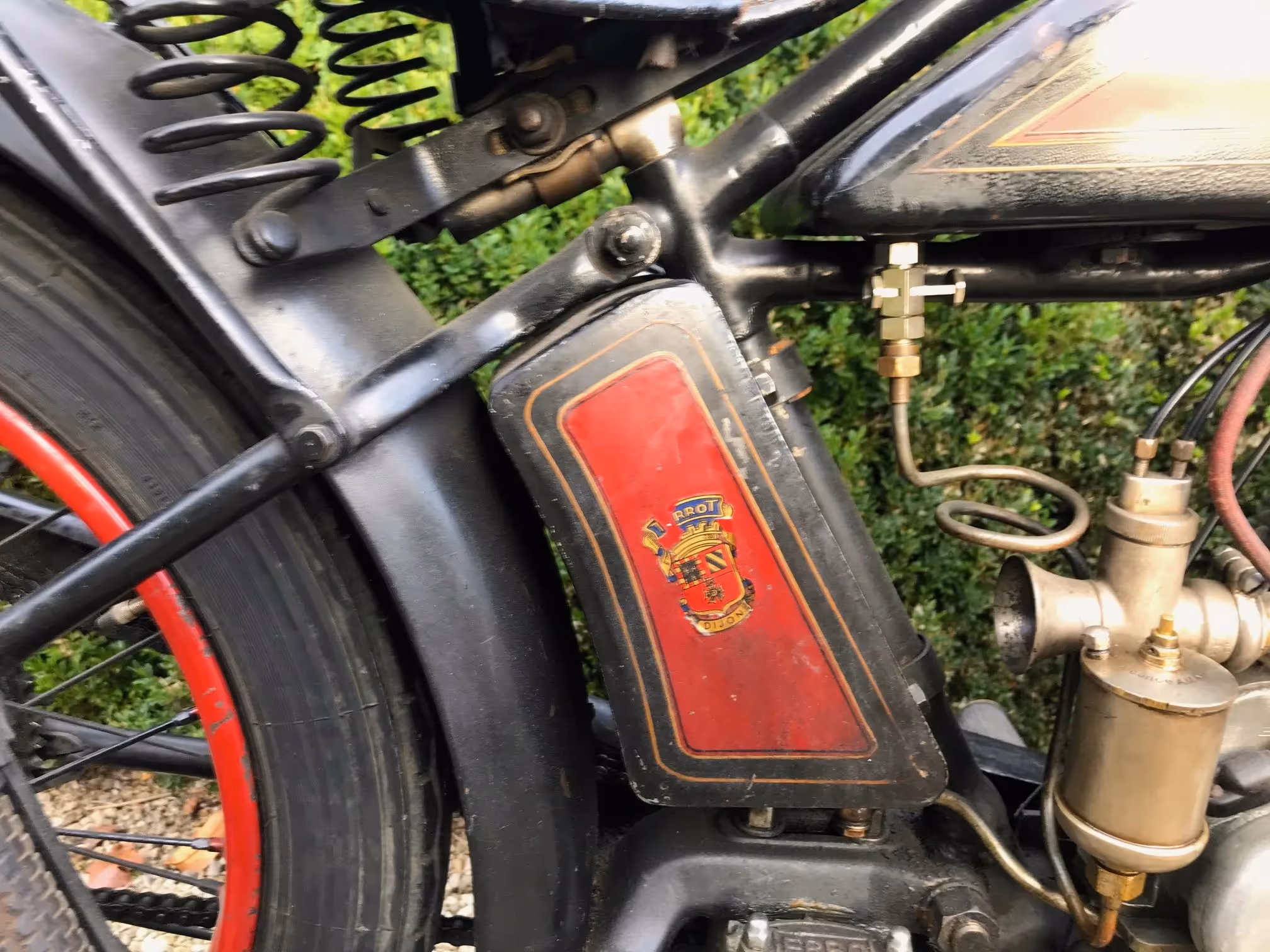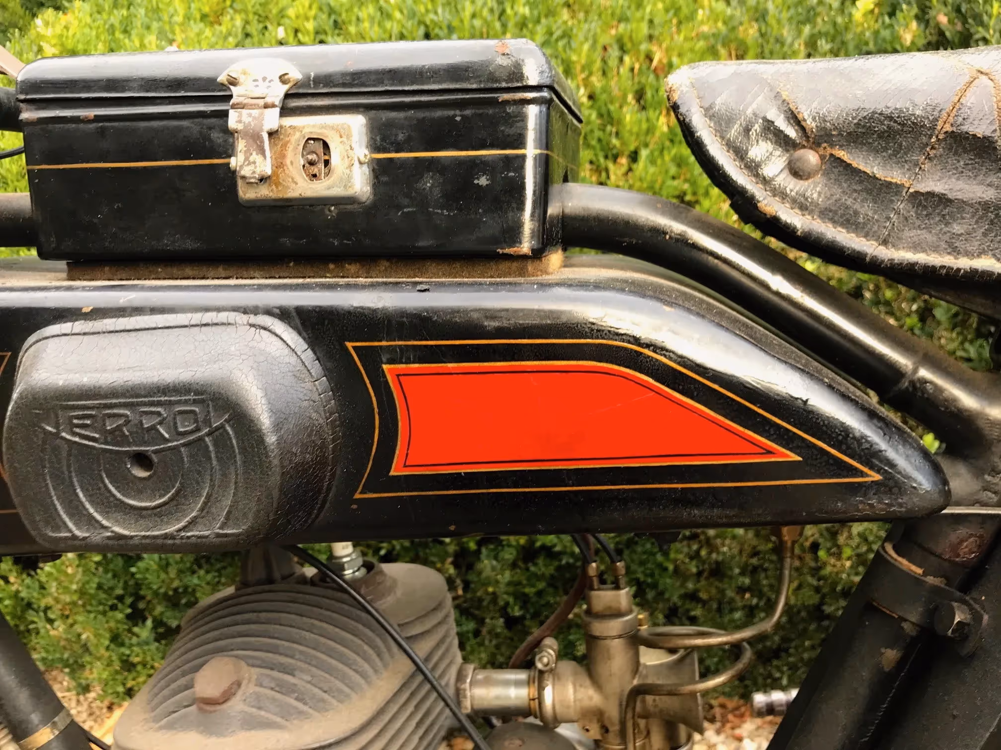 Franse Terrot model HSC. Dit is een Sport Confort 350cc zijklepper van 1928 in mooi originele staat. Dit is het laatste jaar van de flattankers. Vanaf 1929 zijn de modellen stilaan overgeschakeld naar zadeltank modellen. Dit is nog het mooie model met oliedruppelaar in de tank. Motor start en rijdt maar heeft eens een goed onderhoud/nazicht nodig.