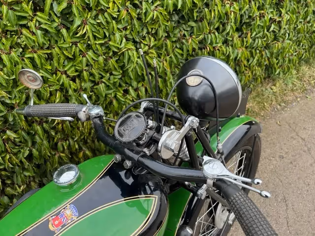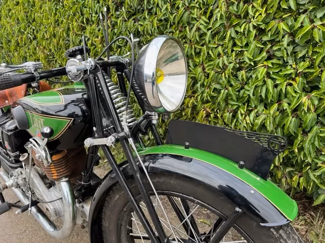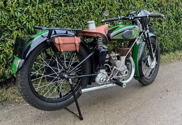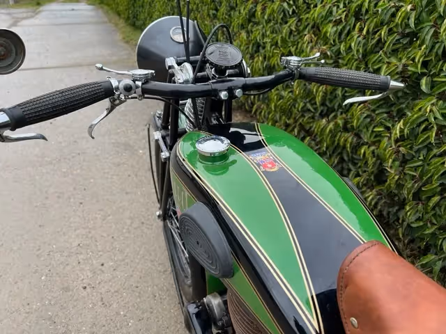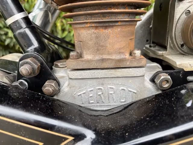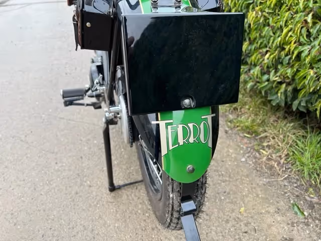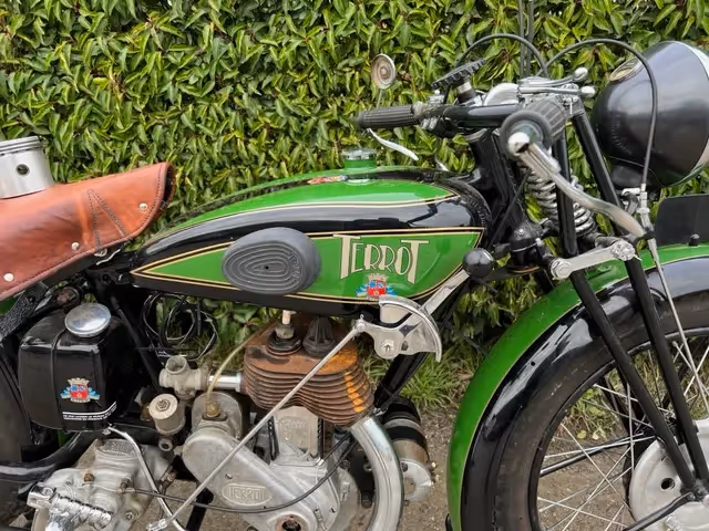 Franse Terrot model HST. Dit is een 350cc zijklepper van 1930. Zeer mooie restauratie die niet afgewerkt is door overlijden van de eigenaar. Motorfiets is los samengebouwd om te kunnen laten zien wat er allemaal is. Onderblok is gereviseerd, cilinder moet nog gedaan worden. Er is al de nieuwe zuiger bij om af te werken.