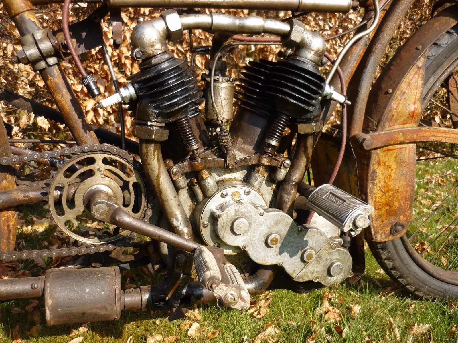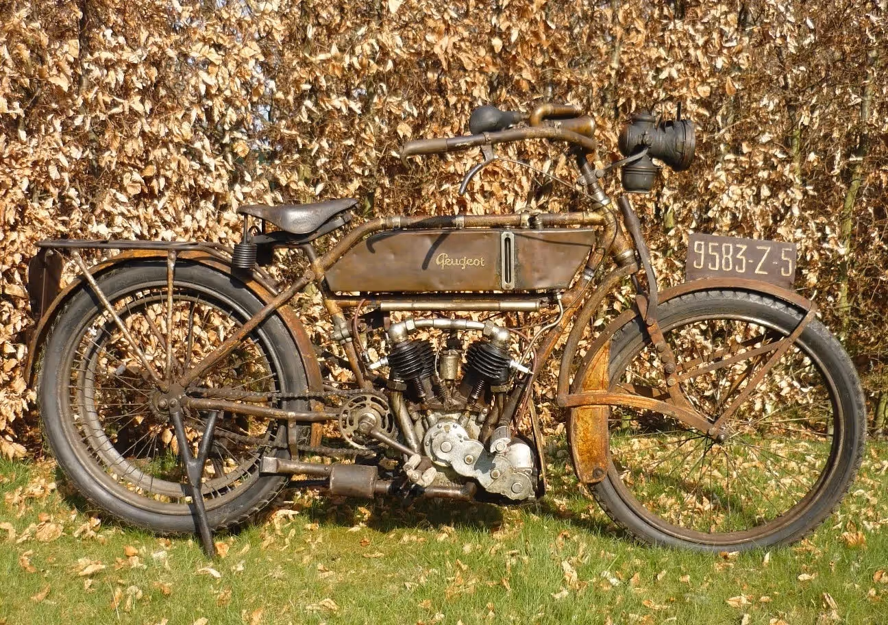 Zeldzame Franse Peugeot V-twin van 1914. Dit is een model Z met een 662cc 2 cilinder. Deze moto heeft geen versnellingsbak en geen koppeling maar door de hendel links aan de tank kan men de spanning op de aandrijfriem wegnemen zodat men toch een vrijloop heeft.