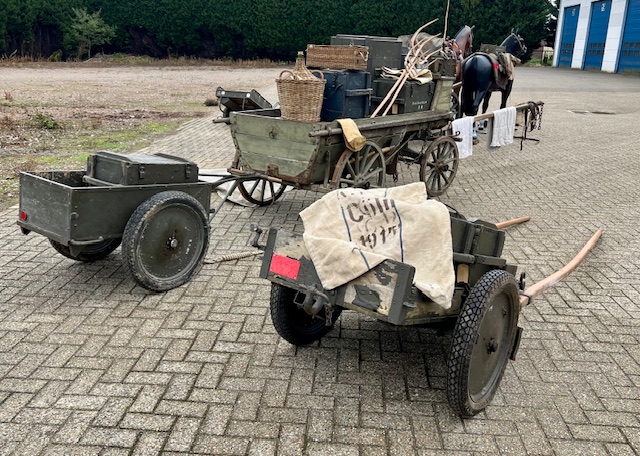 Veldkeuken (Goulashkanone) met bevoorradingskarren uit de Eerste Wereldoorlog, compleet en geheel nieuw! De veldkeuken koets is compleet met alle kookgerei en slagersbenodigdheden. De tweede koets is een bevoorradingskar die gebruikt werd om voedsel te vervoeren. Deze koets heeft ook de aanhanger die gebruikt werd om het brandhout voor de ketels te vervoeren. Deze koets heeft ook de dissels om met één of twee paarden te trekken. De derde kleine kar kon door één paard getrokken worden en werd gebruikt om extra brandhout in het bos te verzamelen of om kadavers van dieren te verzamelen om op de hoofdwagen te versnijden en te verwerken in het eten. Deze wagens bevatten veel kleine originele items die niet gedetailleerd op de foto's te zien zijn.Veel van deze extra's zijn gestempeld 1916-17-18. Een unieke kans voor een museum of reanactment groep.