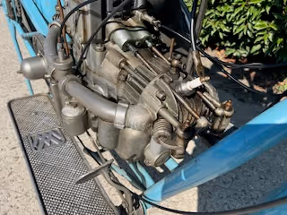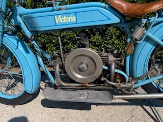 Duitse Victoria KR3. Dit is een 500cc boxer kopklepper van 1924. Topmodel van de vroege Duitse motorfietsen. Victoria starte in 1922 met de KR1, deze had het BMW blok voordat BMW motorfietsen maakte. In 1923 ging BMW zelf motorfietsen maken en leverde ze hun blok niet meer aan Victoria, Helios, Bizon,.. Hierdoor heeft Victoria een blok gelijkaardig aan het BMW blok maar dan een kopklepper laten ontwerpen door Martin Stolle bij de firma "Motorenbau Sedlbauer". Later in 1923 koopt Victoria deze motoren bouwer op. Het model KR2 was dus identiek aan de KR1 maar met een kopklepperblok en nog riemaandrijving. De KR 3 kreeg dan ketting aandrijving en een 3 versnellingen bak en een verbeterde ophanging. Dit is hier zo een verbeterde versie. Het is een oudere restauratie maar alles is mooi origineel. Motor is zeer goed, 1 x trappen en loopt mooi.
