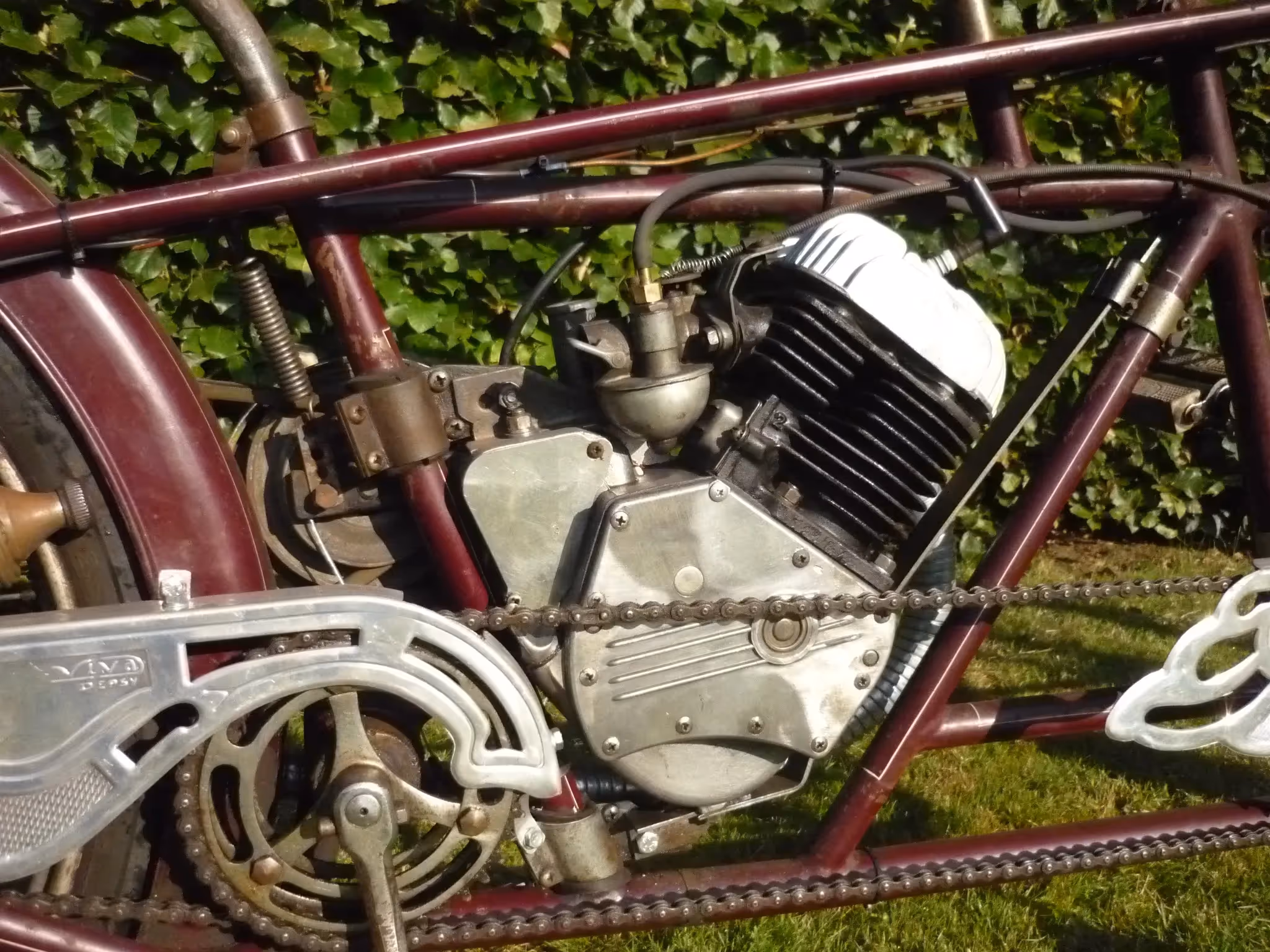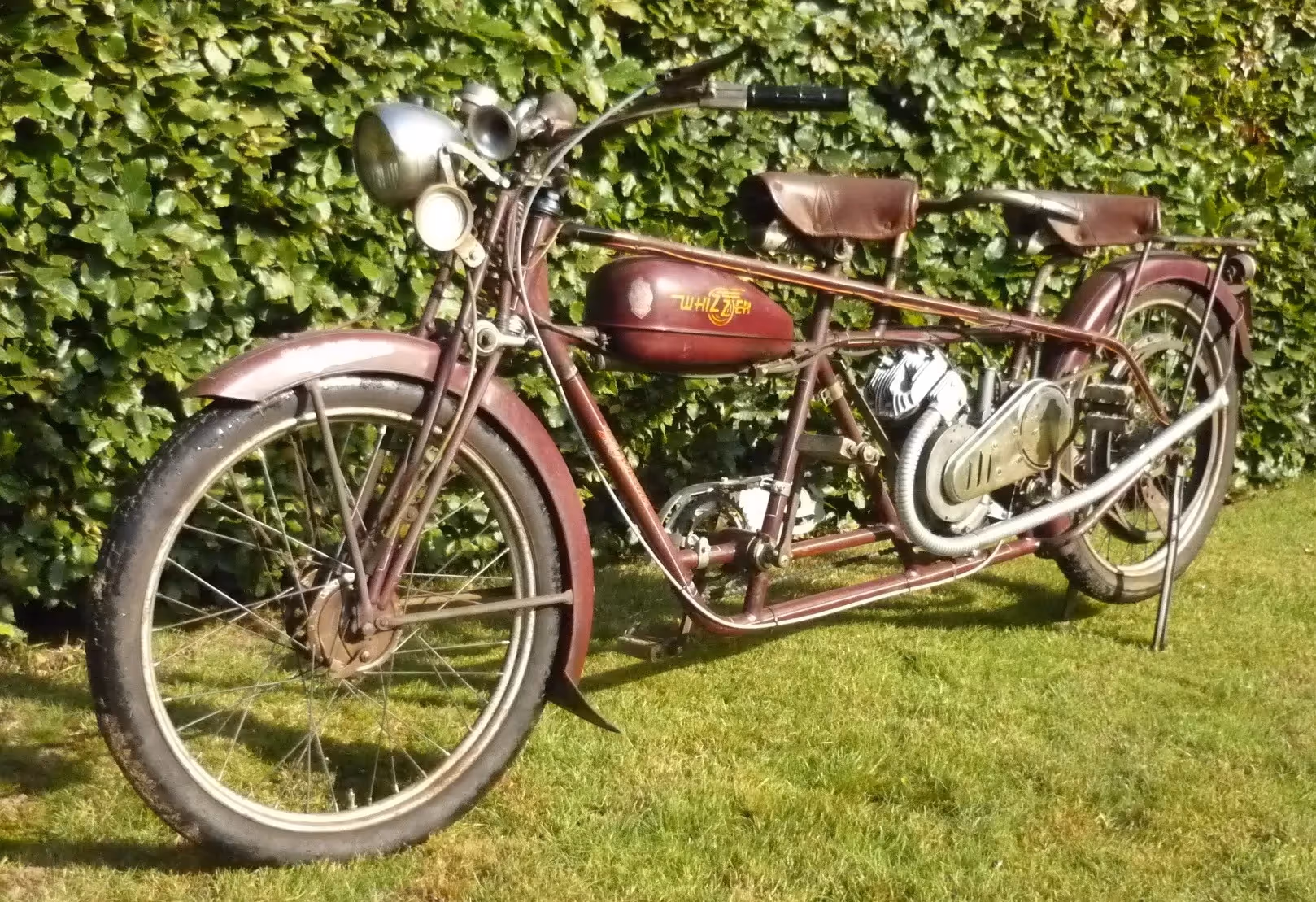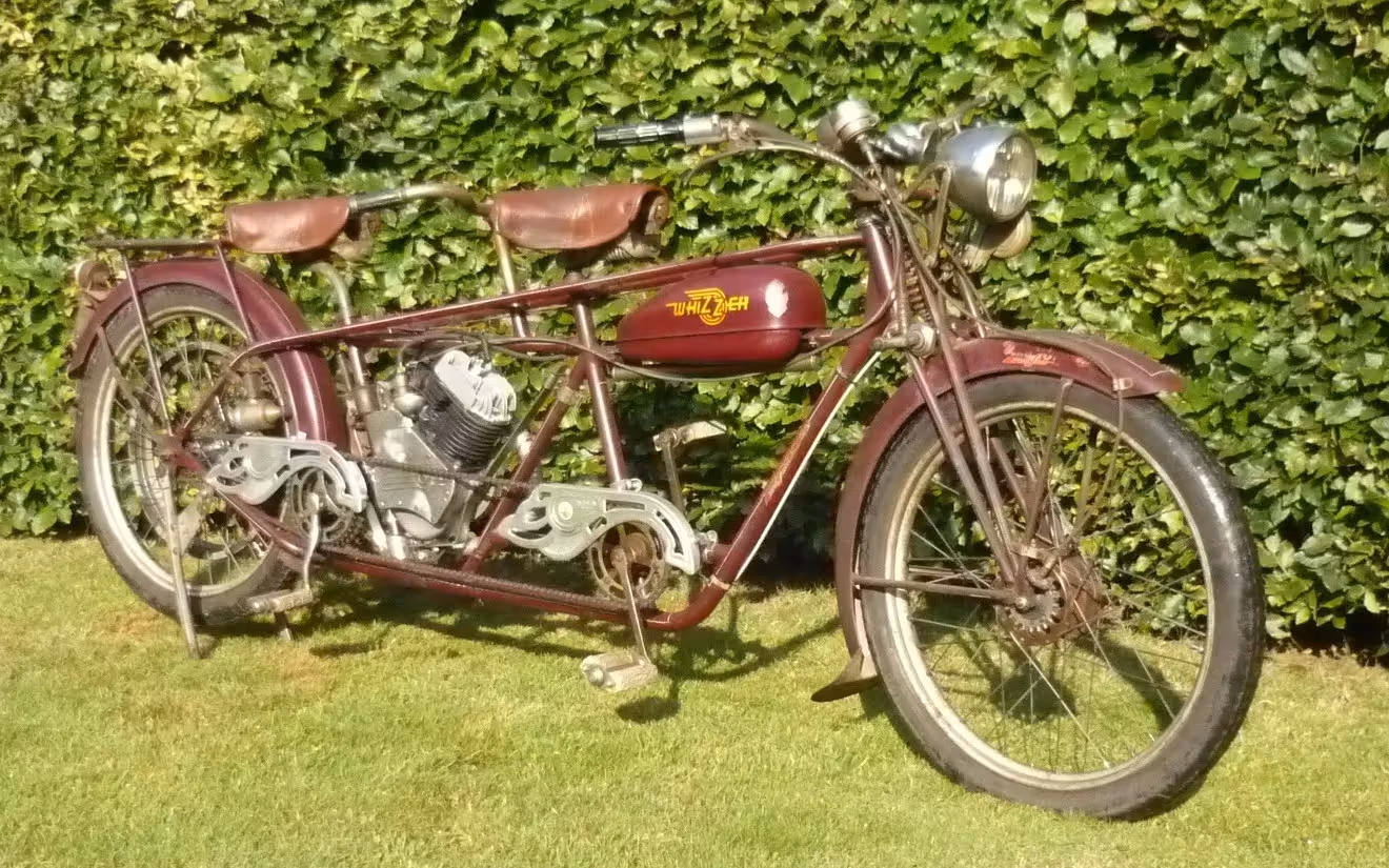 Amerikaanse Whizzer tandem die in Luxemburg gebouwd is. Dit is een 138cc 4 takt zijklepper met riemaandrijving.