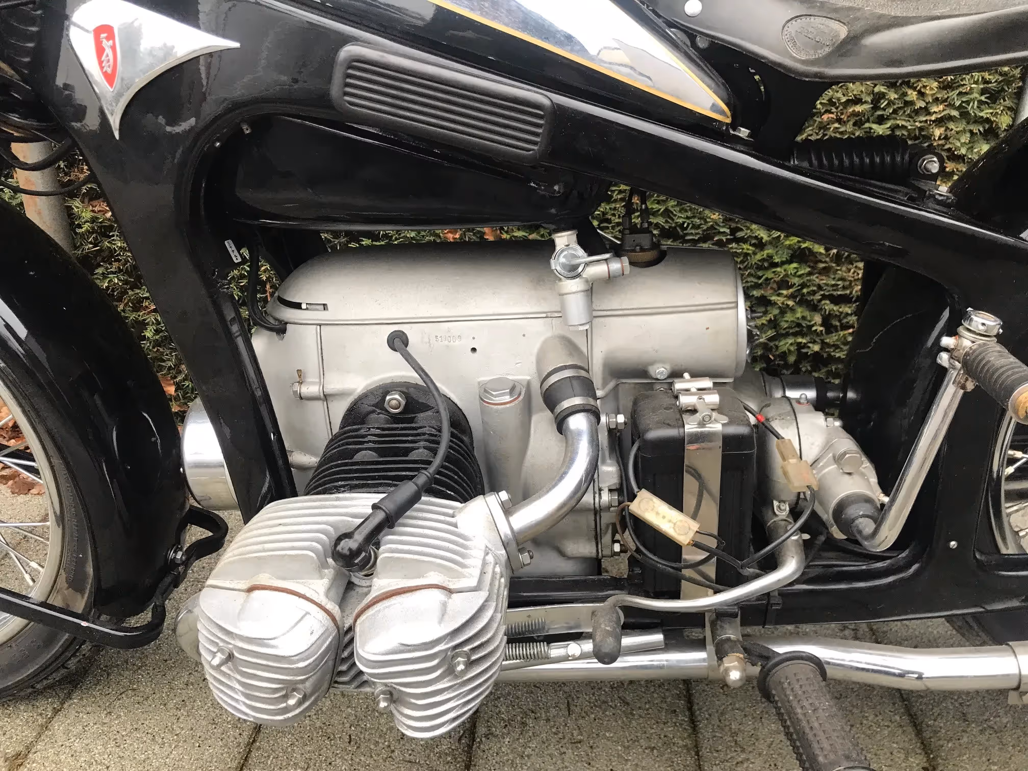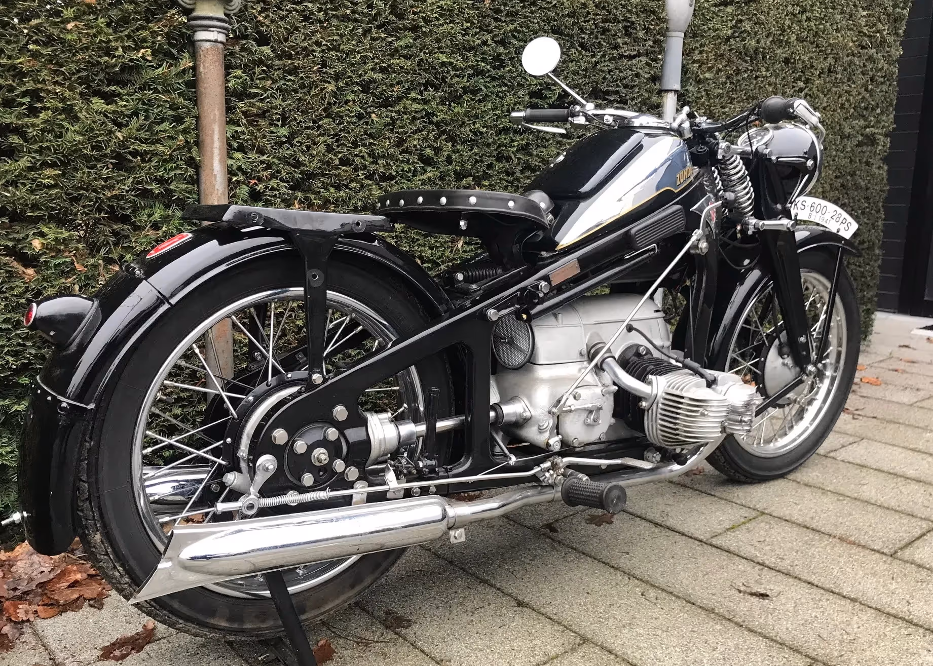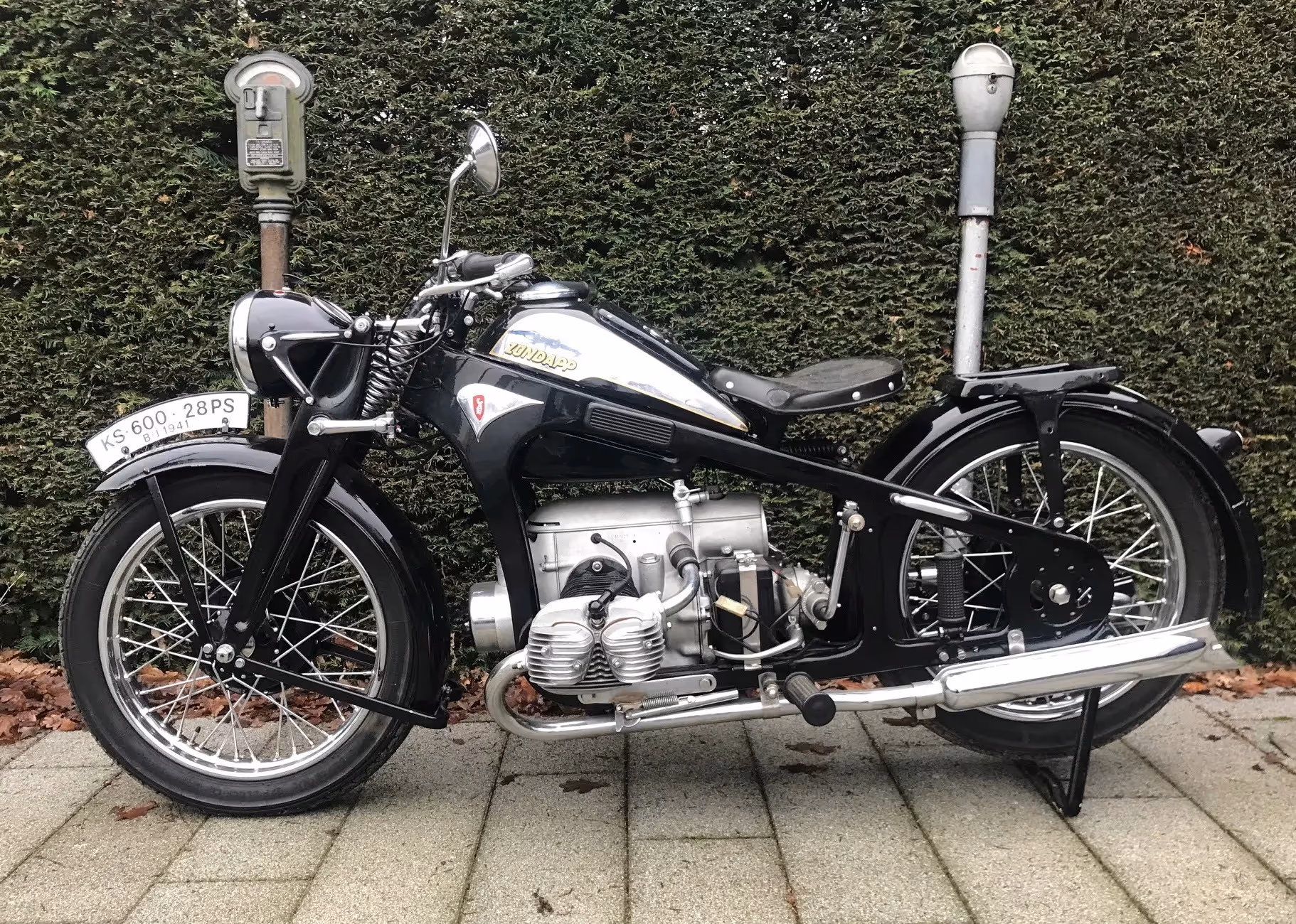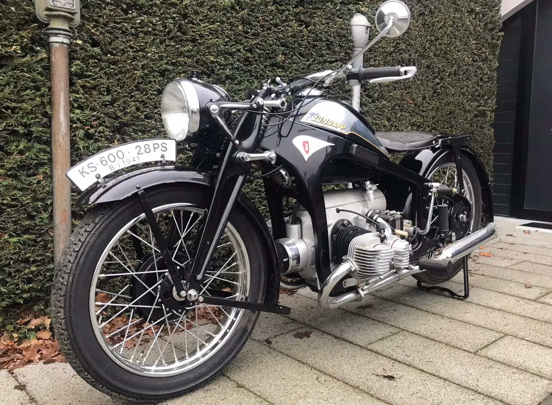 Duitse Zündapp KS600. Dit is een 600cc kopklepper boxer motor met karden aandrijving. Degelijke en snelle motorfiets gemaakt voor de toen door Hitler eerste aangelegde autosnelwegen. Standaard motorfiets in het Duitse leger samen met de BMW R12 wat een 750cc zijklepper was. Dit is een mooie restauratie, motor start en loopt goed maar is nog niet ingereden.