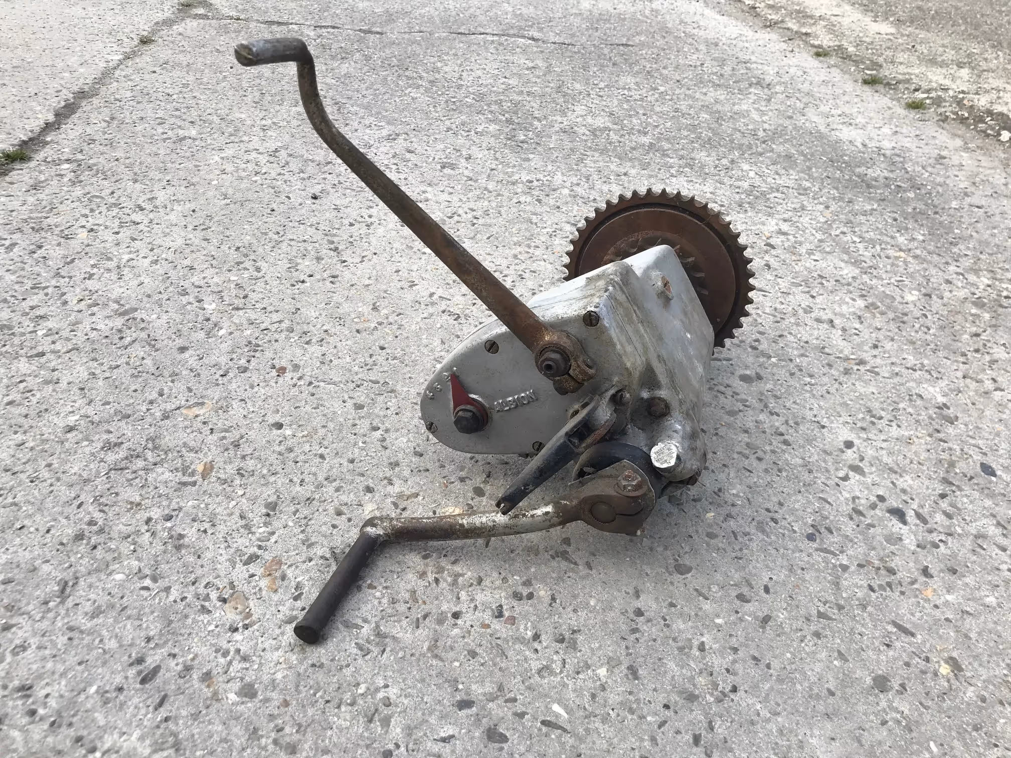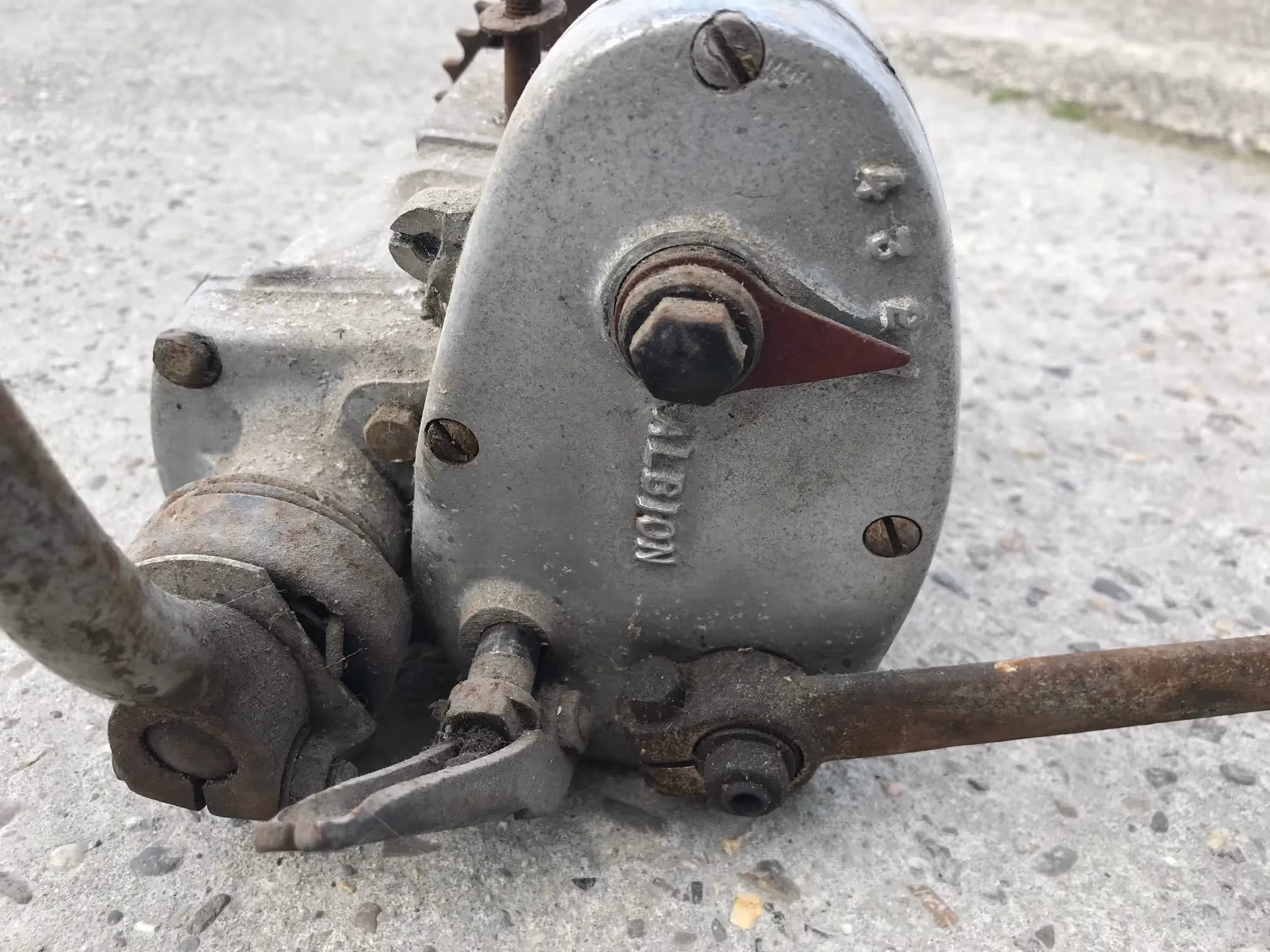Engelse versnellingsbak van het merk Albion. Dit is een 4 versnellingen met kickstarter versnellingpedaal en koppeling.