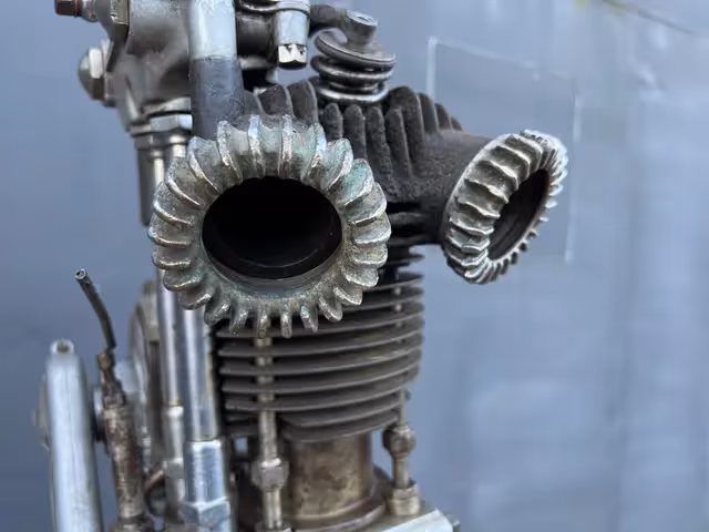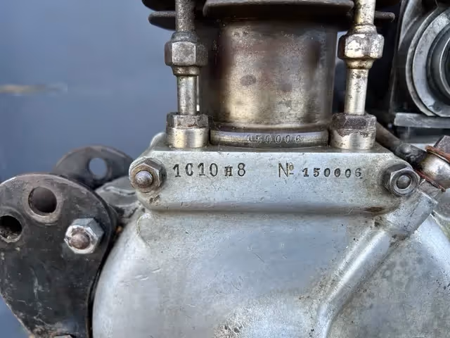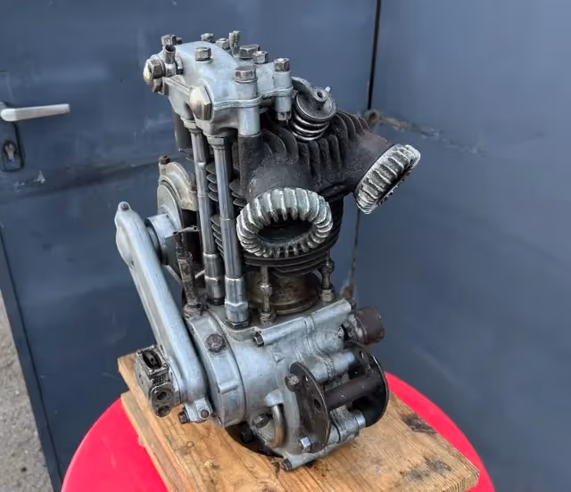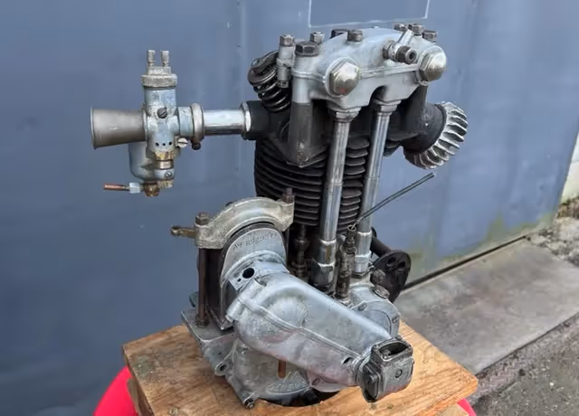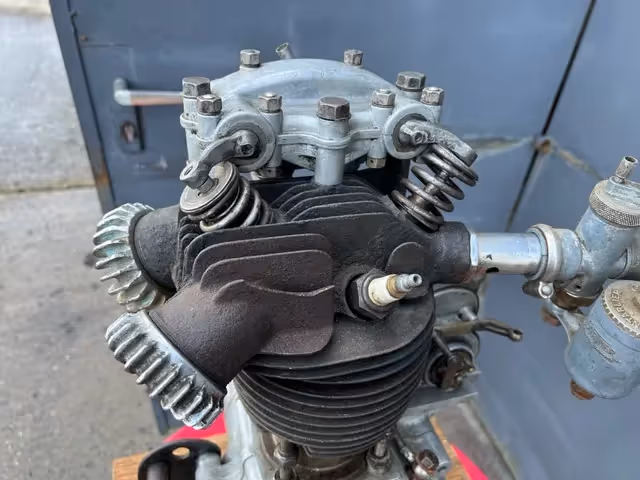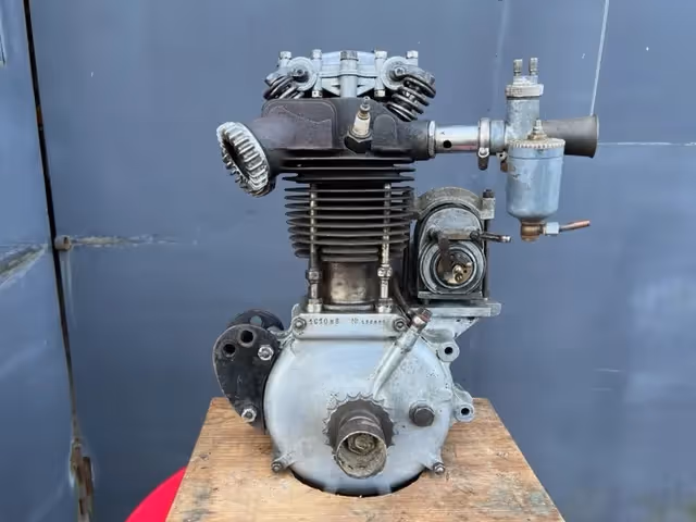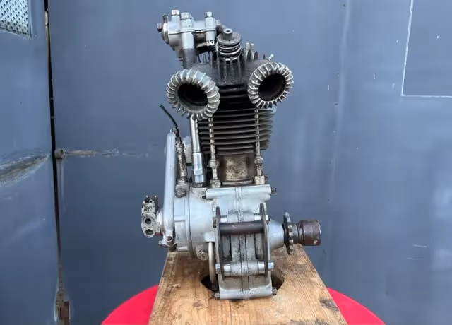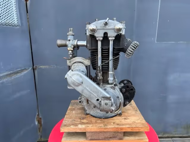 Dit blok is nummer 6 gemaakt in 1929 en is hun sport 250cc kopklepper blok. Prachtig motorblok met 2 zeer grote uitlaten, compleet met magneto en carburator.